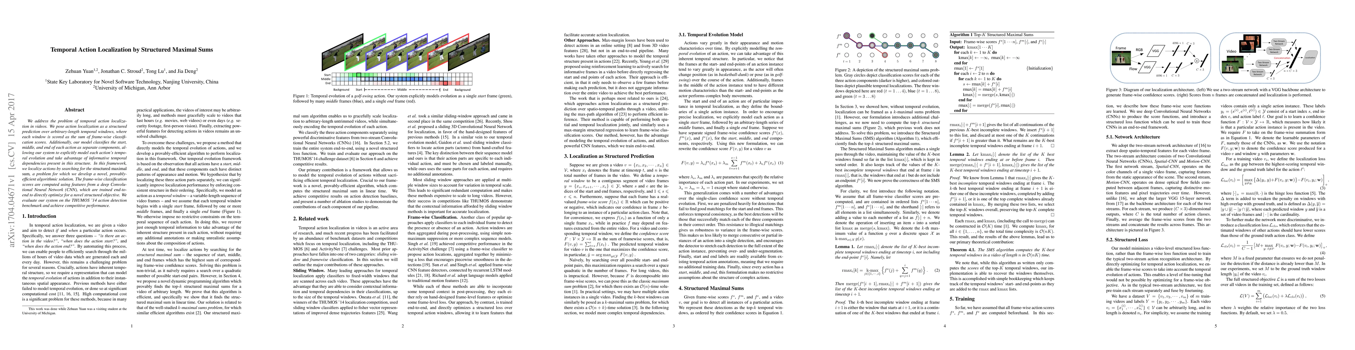 Researchers develop a novel algorithm for temporal action localization in videos that achieves competitive performance on the THUMOS 14 benchmark by modeling actions as structured maximal sums.
