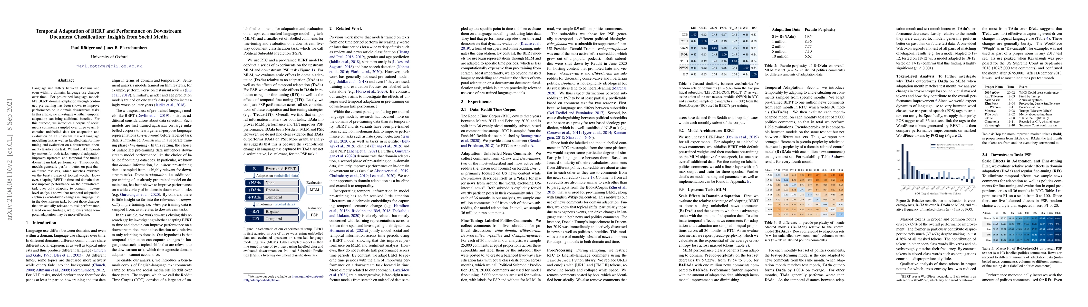 Temporal adaptation of BERT improves performance on downstream document classification tasks in social media comments sampled over three years. Temporal fine-tuning is found to capture event-driven changes in language use that are relevant to task performance.