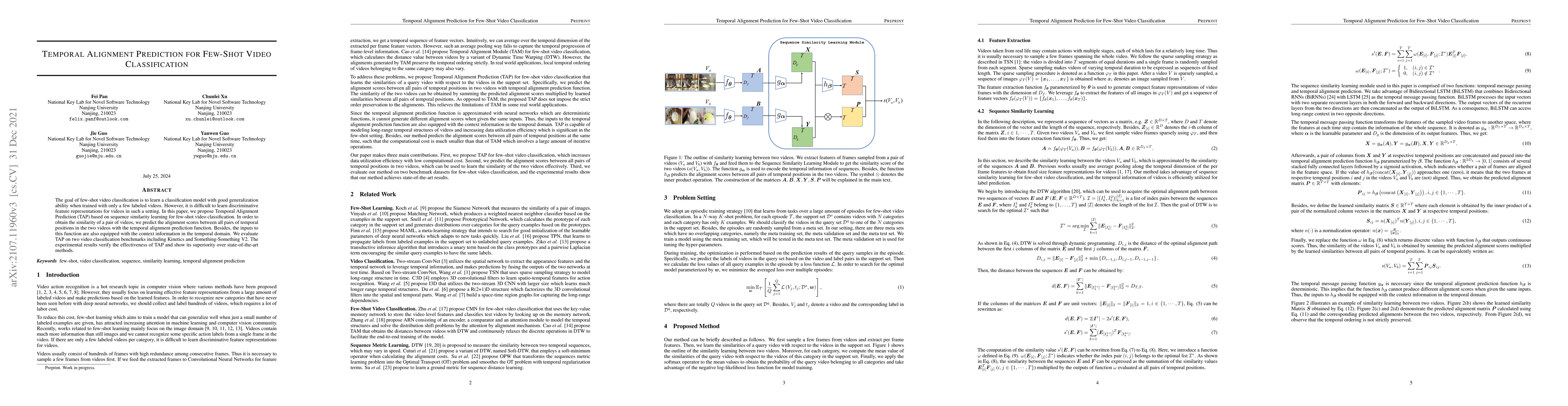 This paper proposes Temporal Alignment Prediction (TAP) for enhancing few-shot video classification by learning sequence similarity through alignment scores between temporal positions. Experimental results on Kinetics and Something-Something V2 benchmarks demonstrate TAP's effectiveness and superiority over existing methods.