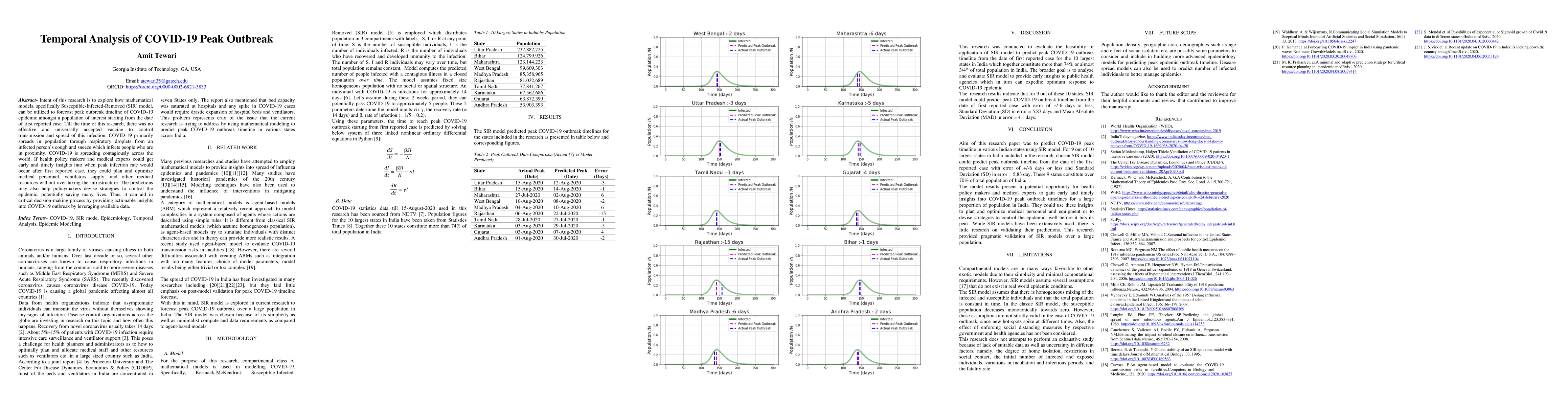 Intent of this research is to explore how mathematical models, specifically Susceptible-Infected-Removed (SIR) model, can be utilized to forecast peak outbreak timeline of COVID-19 epidemic amongst a population of interest starting from the date of first reported case. Till the time of this research, there was no effective and universally accepted vaccine to control transmission and spread of this infection. COVID-19 primarily spreads in population through respiratory droplets from an infected person cough and sneeze which infects people who are in proximity. COVID-19 is spreading contagiously across the world. If health policy makers and medical experts could get early and timely insights into when peak infection rate would occur after first reported case, they could plan and optimize medical personnel, ventilators supply, and other medical resources without over-taxing the infrastructure. The predictions may also help policymakers devise strategies to control the epidemic, potentially saving many lives. Thus, it can aid in critical decision-making process by providing actionable insights into COVID-19 outbreak by leveraging available data.
