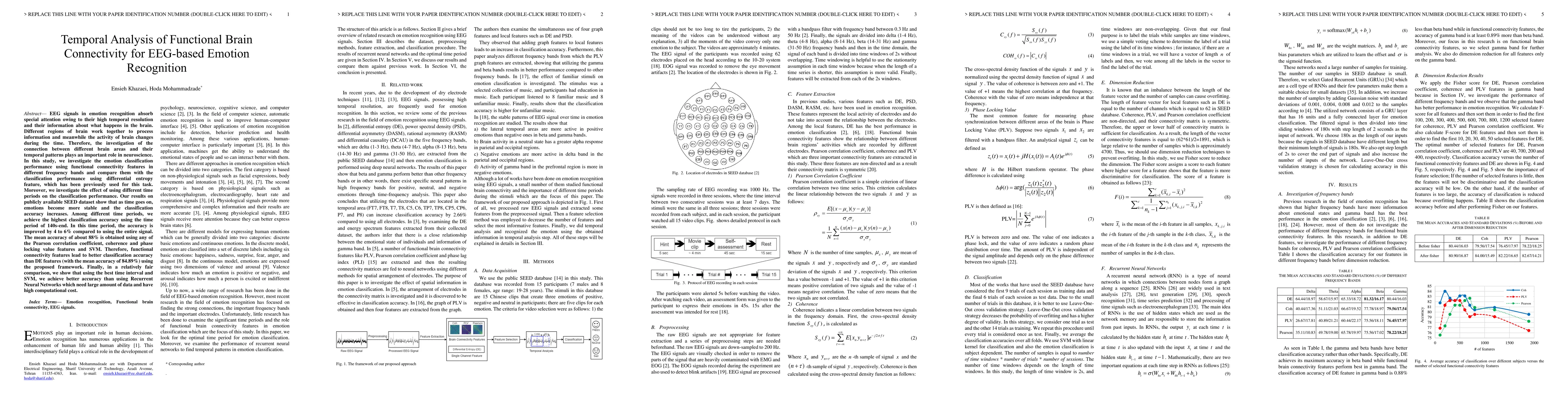 This study analyzes EEG signals for emotion recognition using functional brain connectivity features in various frequency bands. It shows that functional connectivity features, particularly from 140s to the end of the signal, improve classification accuracy (mean 88%) compared to differential entropy features (mean 84.89%), with SVM achieving better results than Recurrent Neural Networks despite higher data and computational costs.
