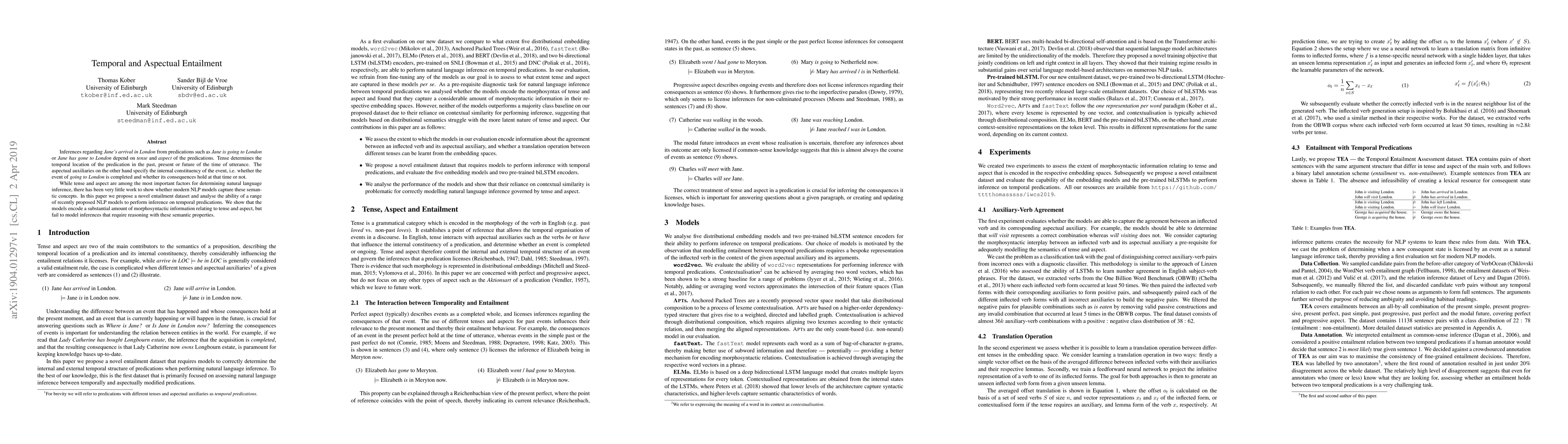 Inferences regarding "Jane's arrival in London" from predications such as "Jane is going to London" or "Jane has gone to London" depend on tense and aspect of the predications. Tense determines the temporal location of the predication in the past, present or future of the time of utterance. The aspectual auxiliaries on the other hand specify the internal constituency of the event, i.e. whether the event of "going to London" is completed and whether its consequences hold at that time or not. While tense and aspect are among the most important factors for determining natural language inference, there has been very little work to show whether modern NLP models capture these semantic concepts. In this paper we propose a novel entailment dataset and analyse the ability of a range of recently proposed NLP models to perform inference on temporal predications. We show that the models encode a substantial amount of morphosyntactic information relating to tense and aspect, but fail to model inferences that require reasoning with these semantic properties.