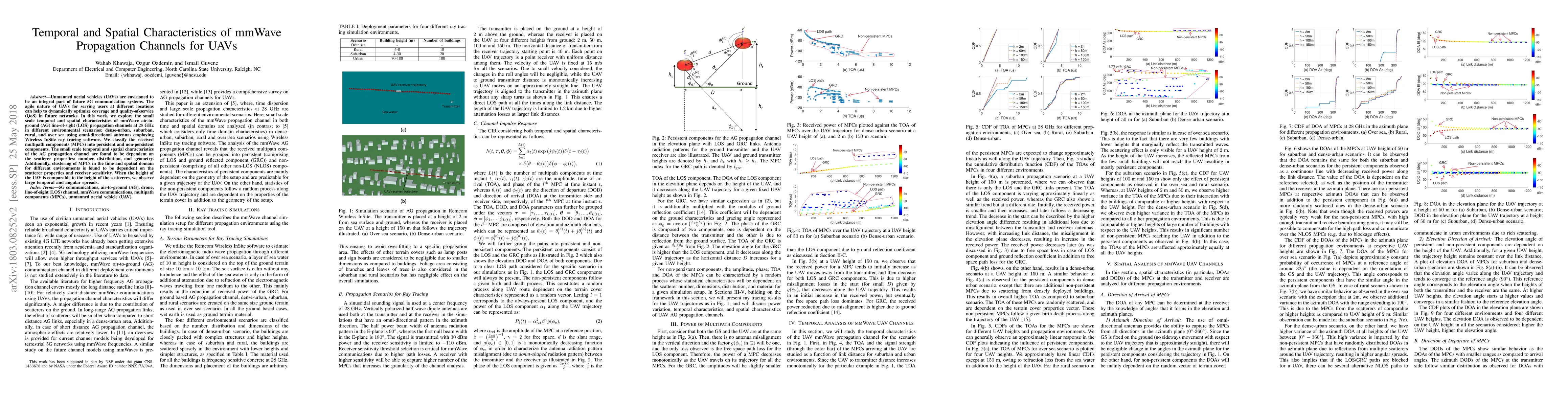 This paper investigates the temporal and spatial characteristics of mmWave air-to-ground propagation channels for UAVs at 28 GHz in various environments. It finds that the propagation depends on the number, distribution, and geometry of scatterers, with significant clustering of multipath components influenced by scatterer properties and receiver sensitivity.