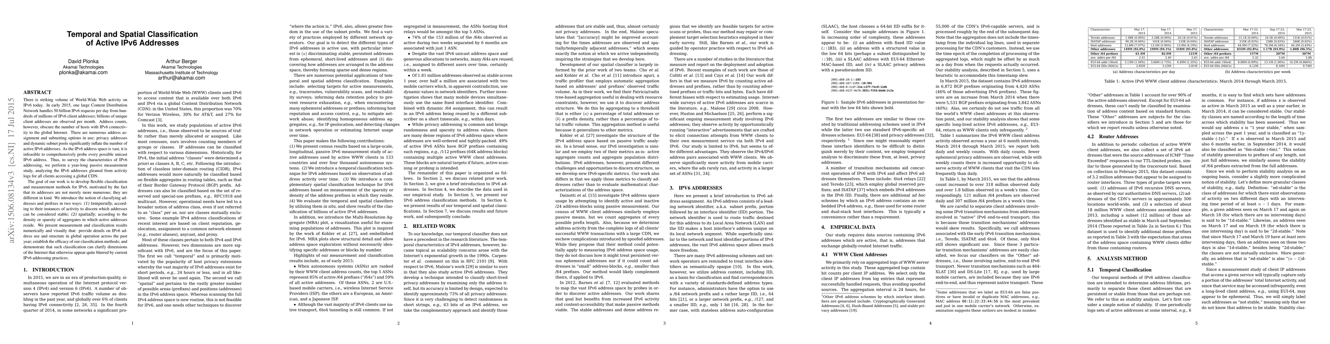 There is striking volume of World-Wide Web activity on IPv6 today. In early 2015, one large Content Distribution Network handles 50 billion IPv6 requests per day from hundreds of millions of IPv6 client addresses; billions of unique client addresses are observed per month. Address counts, however, obscure the number of hosts with IPv6 connectivity to the global Internet. There are numerous address assignment and subnetting options in use; privacy addresses and dynamic subnet pools significantly inflate the number of active IPv6 addresses. As the IPv6 address space is vast, it is infeasible to comprehensively probe every possible unicast IPv6 address. Thus, to survey the characteristics of IPv6 addressing, we perform a year-long passive measurement study, analyzing the IPv6 addresses gleaned from activity logs for all clients accessing a global CDN. The goal of our work is to develop flexible classification and measurement methods for IPv6, motivated by the fact that its addresses are not merely more numerous; they are different in kind. We introduce the notion of classifying addresses and prefixes in two ways: (1) temporally, according to their instances of activity to discern which addresses can be considered stable; (2) spatially, according to the density or sparsity of aggregates in which active addresses reside. We present measurement and classification results numerically and visually that: provide details on IPv6 address use and structure in global operation across the past year; establish the efficacy of our classification methods; and demonstrate that such classification can clarify dimensions of the Internet that otherwise appear quite blurred by current IPv6 addressing practices.