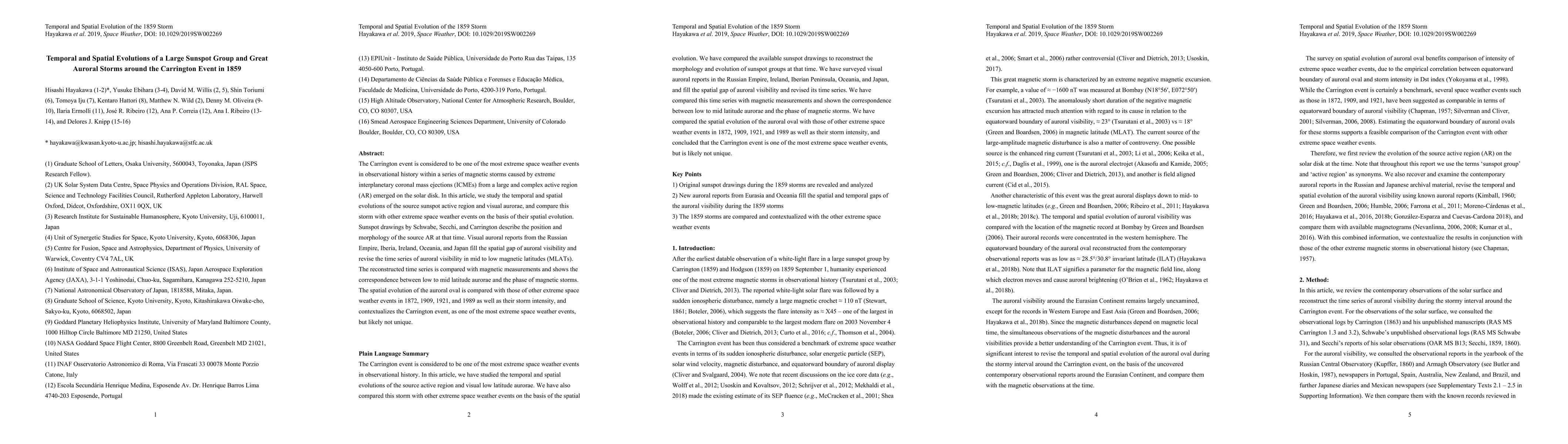 This paper investigates the temporal and spatial evolutions of the sunspot active region and auroral storms associated with the 1859 Carrington event, using historical sunspot drawings and auroral reports. It contextualizes the Carrington event among other extreme space weather events based on auroral oval comparisons and storm intensity.