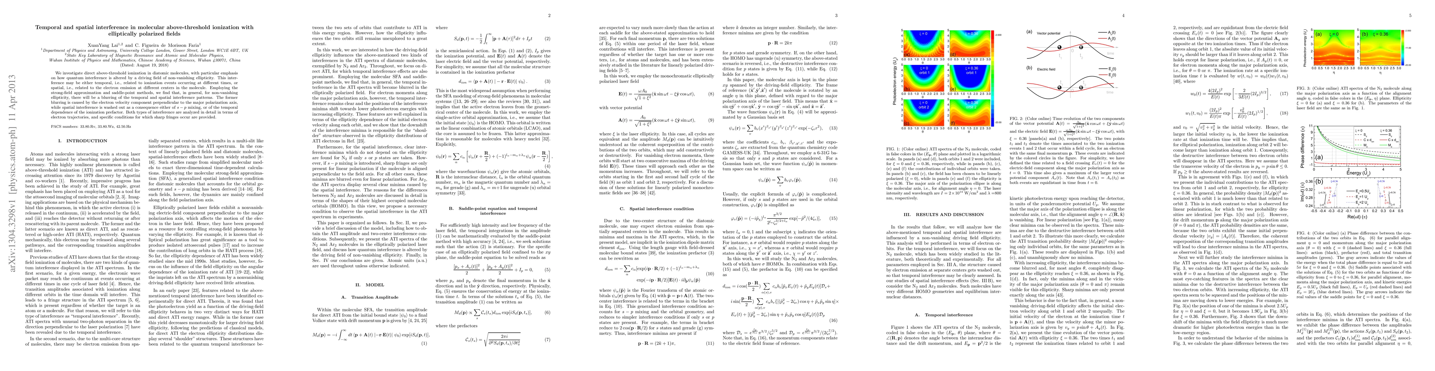 We investigate direct above-threshold ionization in diatomic molecules, with particular emphasis on how quantum interference is altered by a driving field of non-vanishing ellipticity. This interference may be either temporal, i.e., related to ionization events occurring at different times, or spatial, i.e., related to the electron emission at different centers in the molecule. Employing the strong-field approximation and saddle-point methods, we find that, in general, for non-vanishing ellipticity, there will be a blurring of the temporal and spatial interference patterns. The former blurring is caused by the electron velocity component perpendicular to the major polarization axis, while spatial interference is washed out as a consequence either of s-p mixing, or of the temporal dependence of the ionization prefactor. Both types of interference are analyzed in detail in terms of electron trajectories, and specific conditions for which sharp fringes occur are provided.