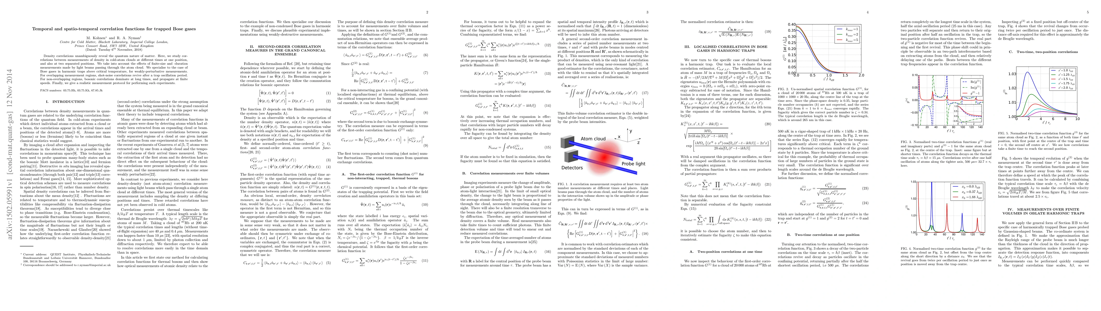 Density correlations unambiguously reveal the quantum nature of matter. Here, we study correlations between measurements of density in cold-atom clouds at different times at one position, and also at two separated positions. We take into account the effects of finite-size and -duration measurements made by light beams passing through the atom cloud. We specialise to the case of Bose gases in harmonic traps above critical temperature, for weakly-perturbative measurements. For overlapping measurement regions, shot-noise correlations revive after a trap oscillation period. For non-overlapping regions, bosonic correlations dominate at long times, and propagate at finite speeds. Finally, we give a realistic measurement protocol for performing such experiments.