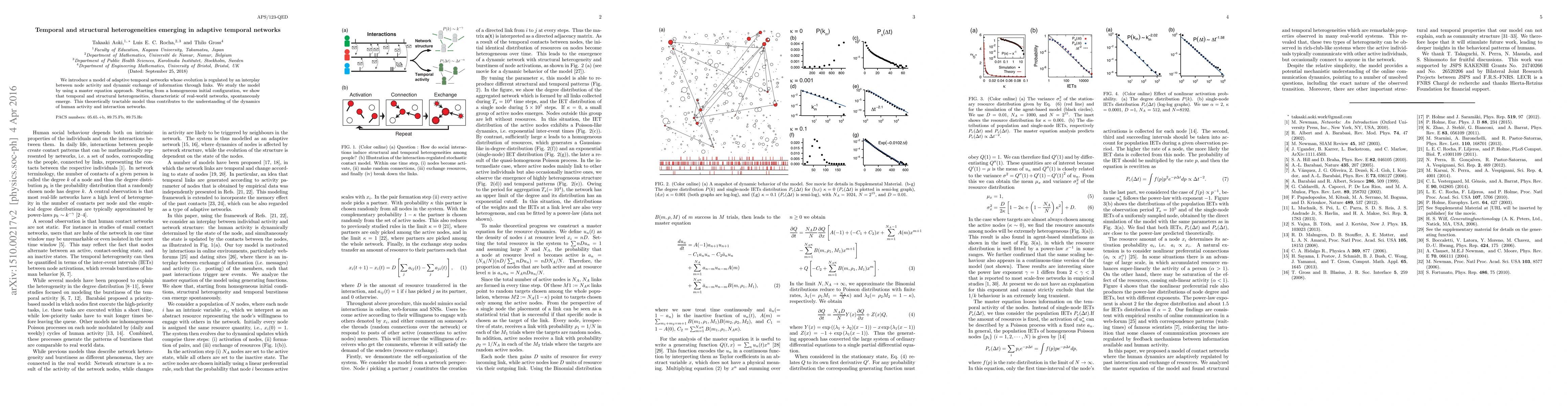 This paper presents a model of adaptive temporal networks, demonstrating how temporal and structural heterogeneities naturally emerge from an interplay between node activity and dynamic link exchange, using a master equation approach to simulate the network's evolution from a homogeneous state. The findings enhance the understanding of human activity and interaction dynamics.