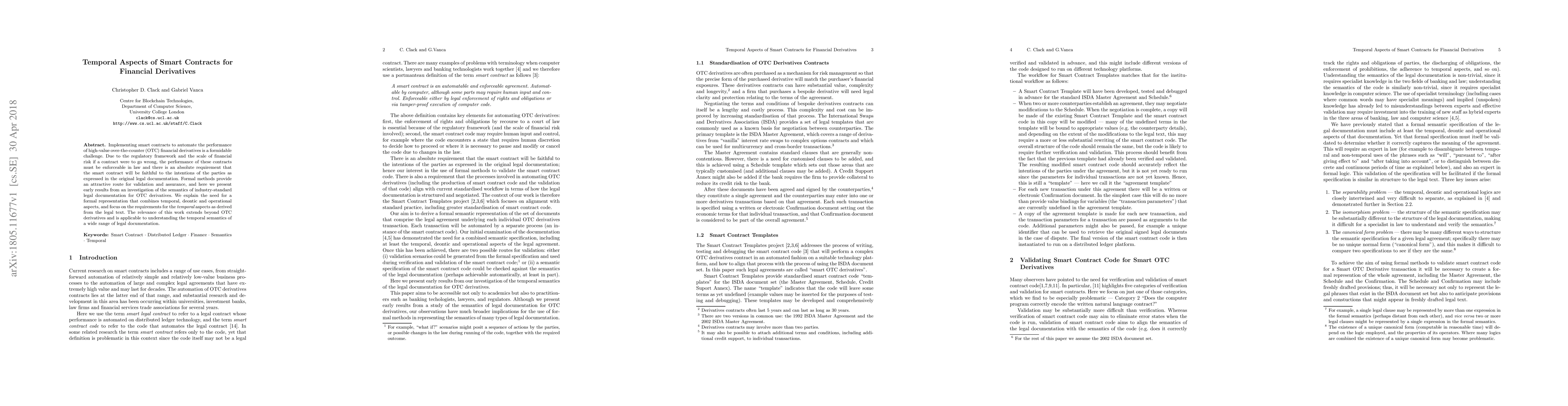 This paper investigates the temporal aspects of smart contracts for automating OTC financial derivatives, focusing on ensuring legal enforceability and fidelity to original legal documentation. It explores the need for a formal representation combining temporal, deontic, and operational elements, with implications extending beyond derivatives to broader legal documentation.