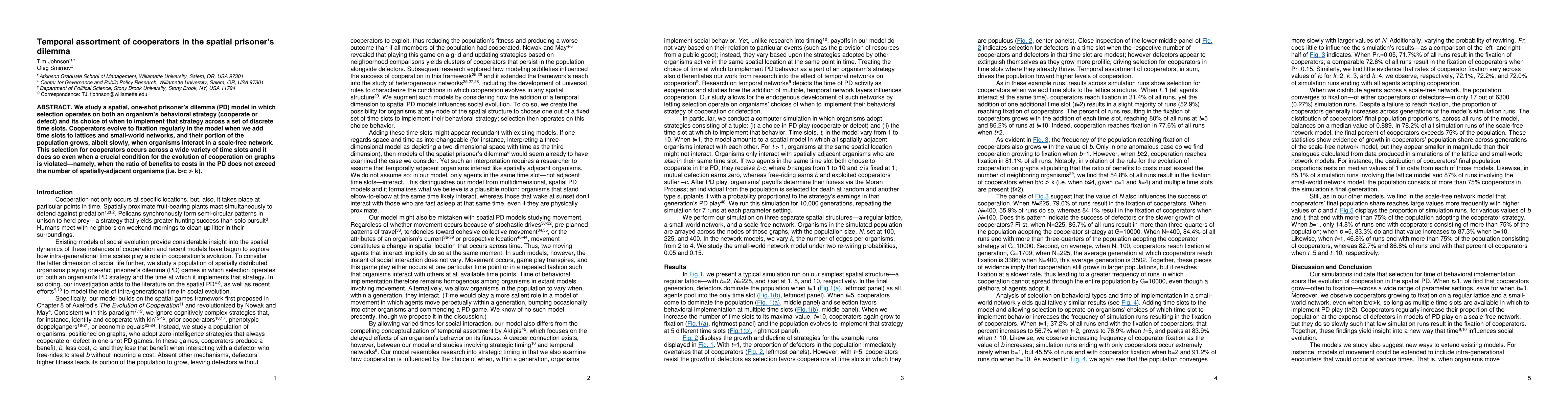 Cooperators evolve to fixation in spatial prisoner's dilemma models with time slots, even when traditional conditions for cooperation are not met. This finding suggests that cooperative behavior can emerge under a wide range of circumstances.