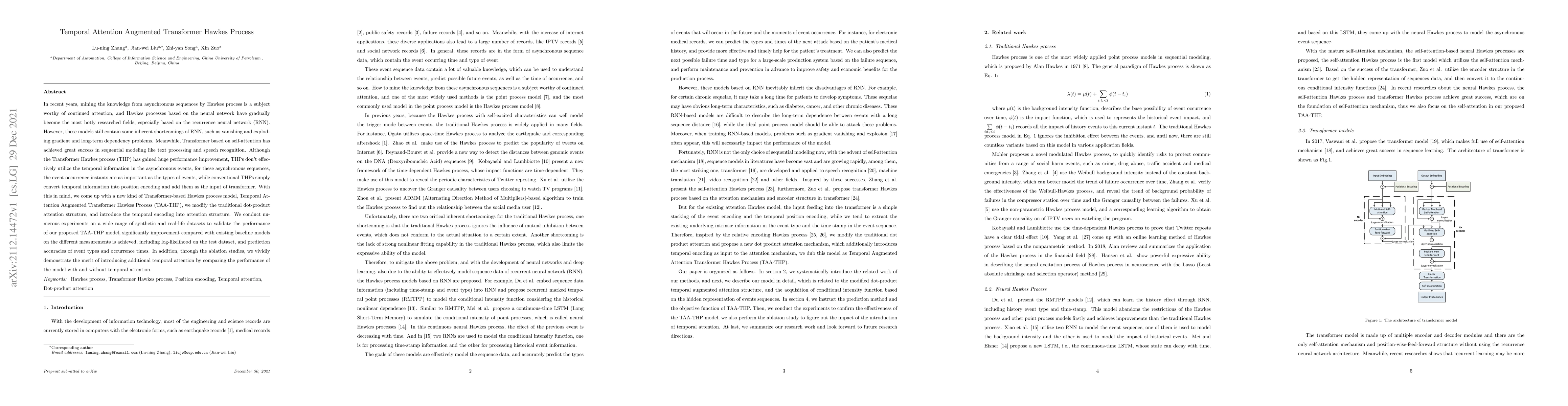 The paper proposes a Temporal Attention Augmented Transformer Hawkes Process (TAA-THP) to improve the modeling of asynchronous sequences, addressing the limitations of existing RNN-based Hawkes processes and conventional Transformer Hawkes processes. The TAA-THP model enhances temporal information utilization through modified attention mechanisms, achieving significant performance improvements in log-likelihood and prediction accuracy on various datasets.