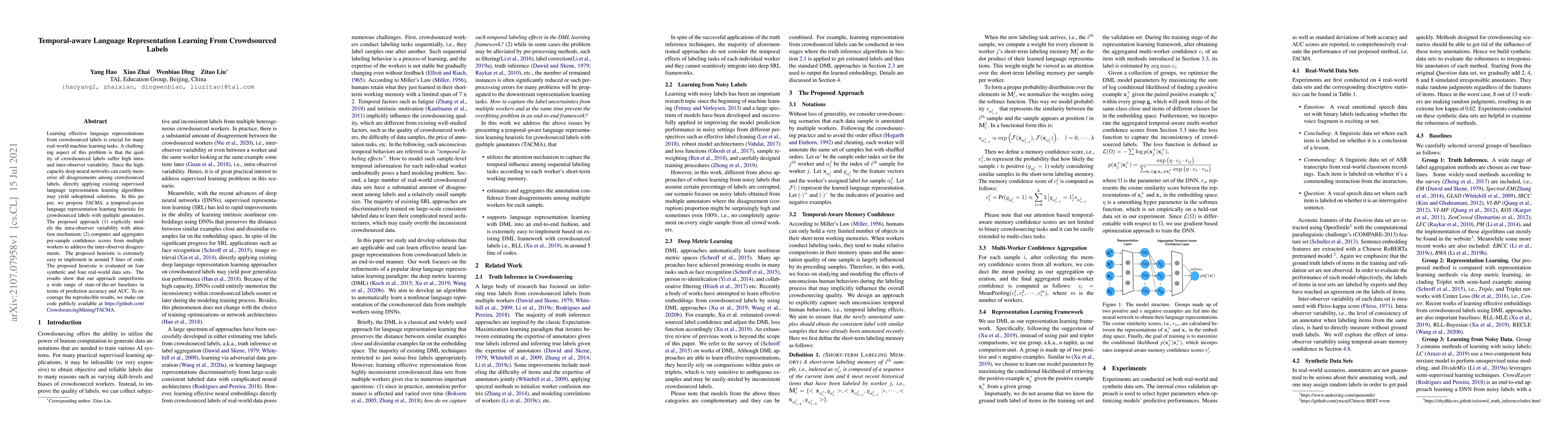 This paper introduces TACMA, a temporal-aware heuristic for learning language representations from crowdsourced labels, addressing intra-observer variability and inter-observer disagreements. The approach outperforms state-of-the-art baselines and is easily implemented with minimal code.