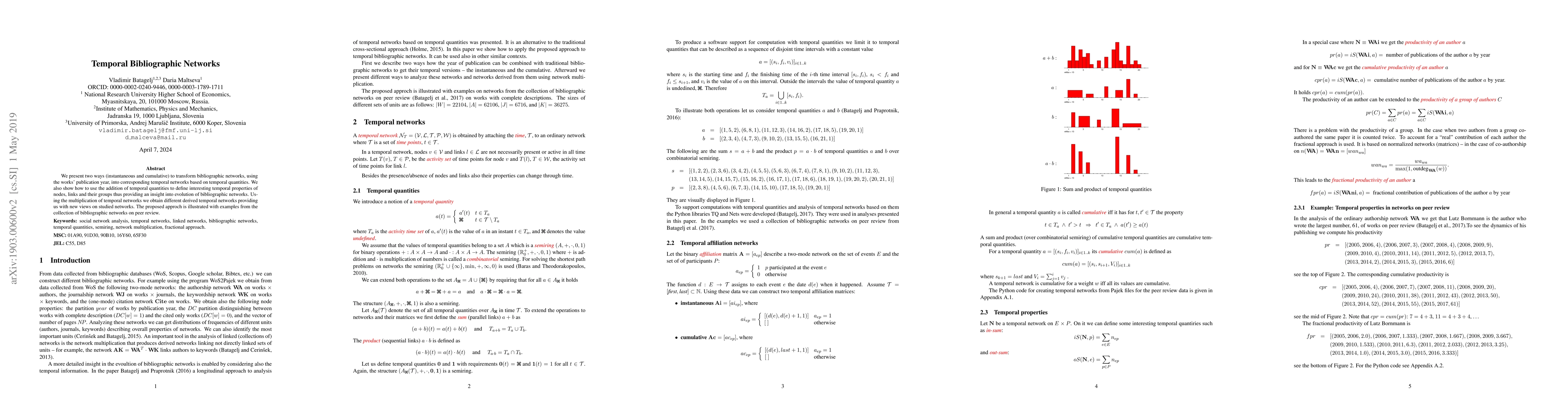 This paper presents methods to transform bibliographic networks into temporal networks based on publication years, offering insights into the evolution of these networks through temporal properties and derived temporal networks, illustrated with examples from peer review collections.