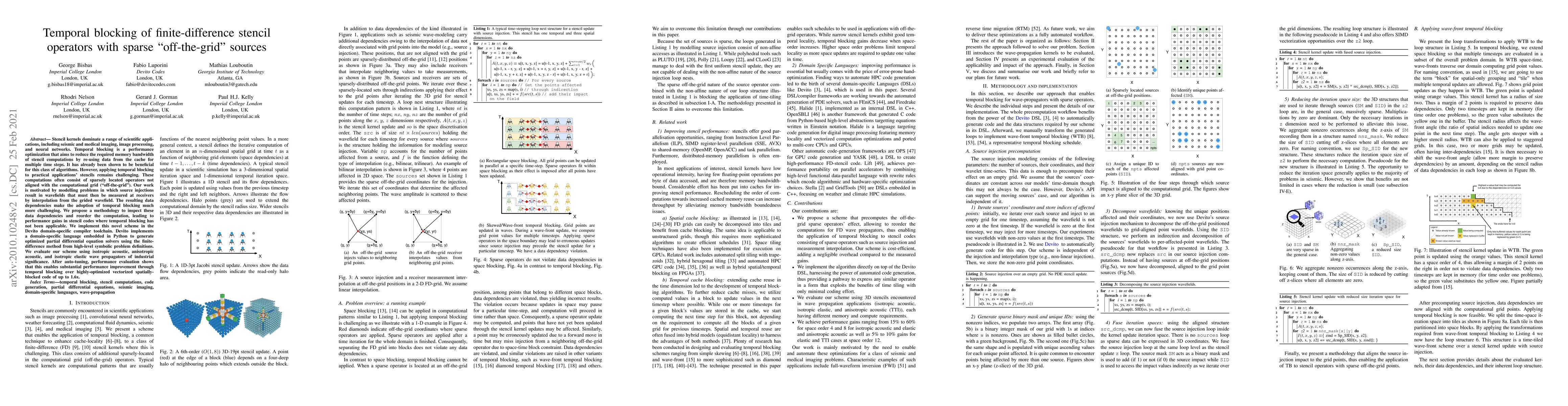 This paper proposes a methodology to apply temporal blocking to stencil computations involving sparse "off-the-grid" sources, which are challenging due to complex data dependencies. The method reorders computations to enable performance gains, implemented in the Devito compiler, and demonstrates up to 1.6x improvement over vectorized spatially-blocked code.