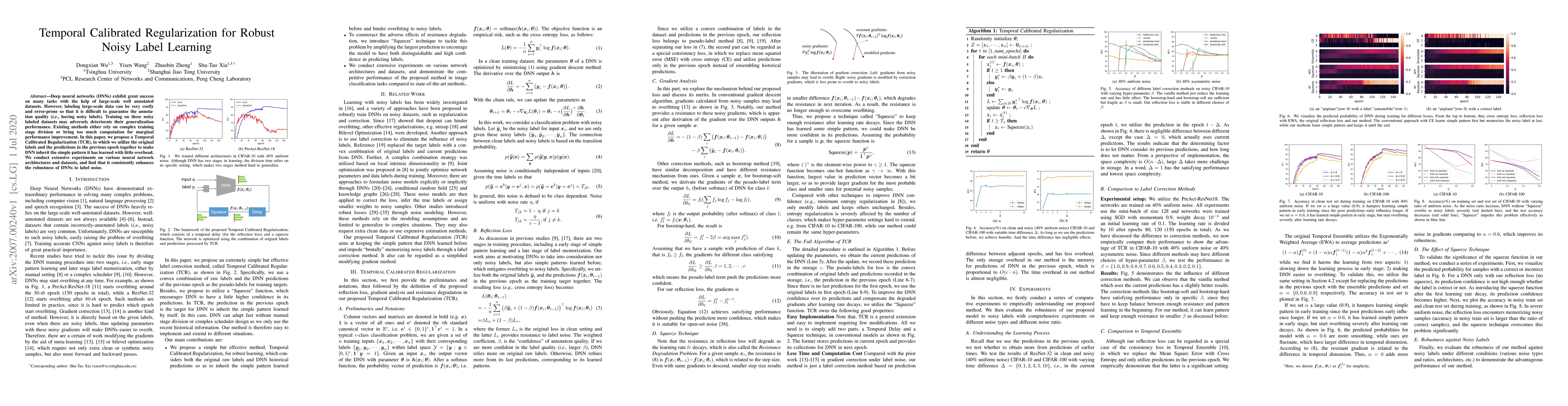Deep neural networks (DNNs) exhibit great success on many tasks with the help of large-scale well annotated datasets. However, labeling large-scale data can be very costly and error-prone so that it is difficult to guarantee the annotation quality (i.e., having noisy labels). Training on these noisy labeled datasets may adversely deteriorate their generalization performance. Existing methods either rely on complex training stage division or bring too much computation for marginal performance improvement. In this paper, we propose a Temporal Calibrated Regularization (TCR), in which we utilize the original labels and the predictions in the previous epoch together to make DNN inherit the simple pattern it has learned with little overhead. We conduct extensive experiments on various neural network architectures and datasets, and find that it consistently enhances the robustness of DNNs to label noise.