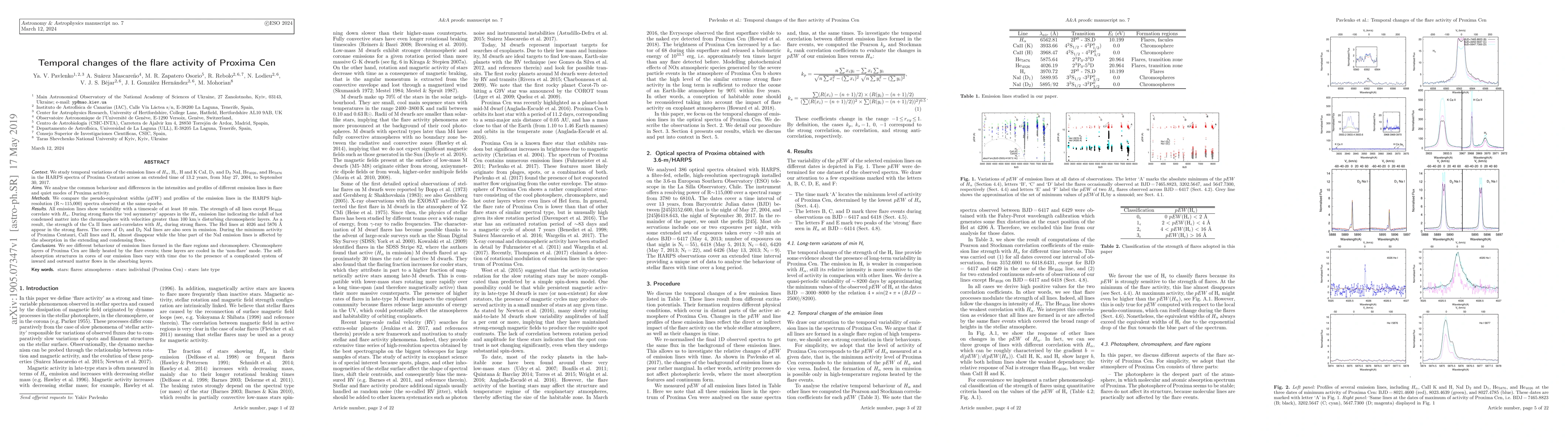 This study analyzes the temporal variations in the emission lines of Proxima Centauri over 13.2 years, revealing that flare activity significantly alters the intensity and profiles of lines like Halpha and Ca II. During strong flares, the Halpha emission line shows 'red asymmetry' due to high-velocity infall of matter, while the Ca II lines weaken, indicating chromospheric heating by flares.