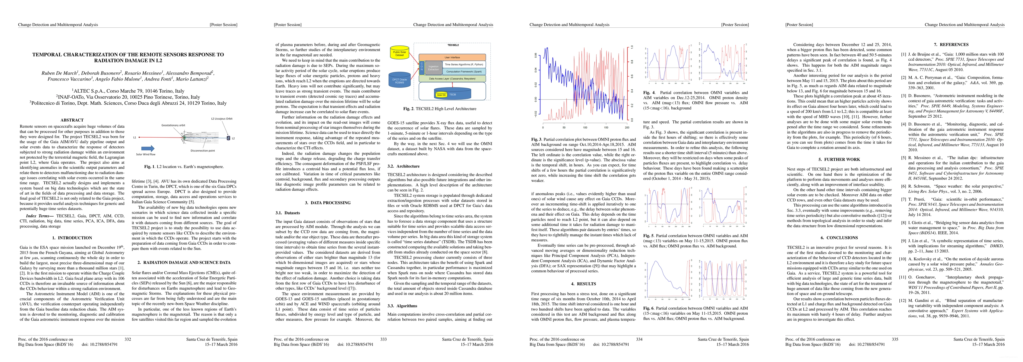 Remote sensors on spacecrafts acquire huge volumes of data that can be processed for other purposes in addition to those they were designed for. The project TECSEL2 was born for the usage of the Gaia AIM/AVU daily pipeline output and solar events data to characterize the response of detectors subjected to strong radiation damage within an environment not protected by the terrestrial magnetic field, the Lagrangian point L2, where Gaia operates. The project also aims at identifying anomalies in the scientific output parameters and relate them to detectors malfunctioning due to radiation damage issues correlating with solar events occurred in the same time range. TECSEL2 actually designs and implements a system based on big data technologies which are the state of art in the fields of data processing and data storage. The final goal of TECSEL2 is not only related to the Gaia project, because it provides useful analysis techniques for generic and potentially huge time series datasets.