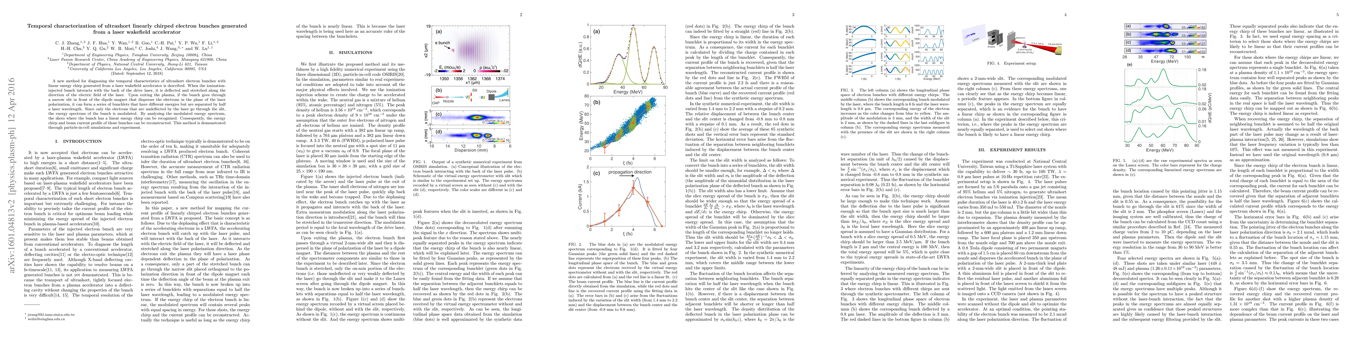This paper presents a novel diagnostic technique to characterize ultrashort electron bunches with linear energy chirps from laser wakefield accelerators, utilizing a slit and dipole magnet to separate bunchlets and reconstruct the energy chirp and beam current profile, validated by simulations and experiments.