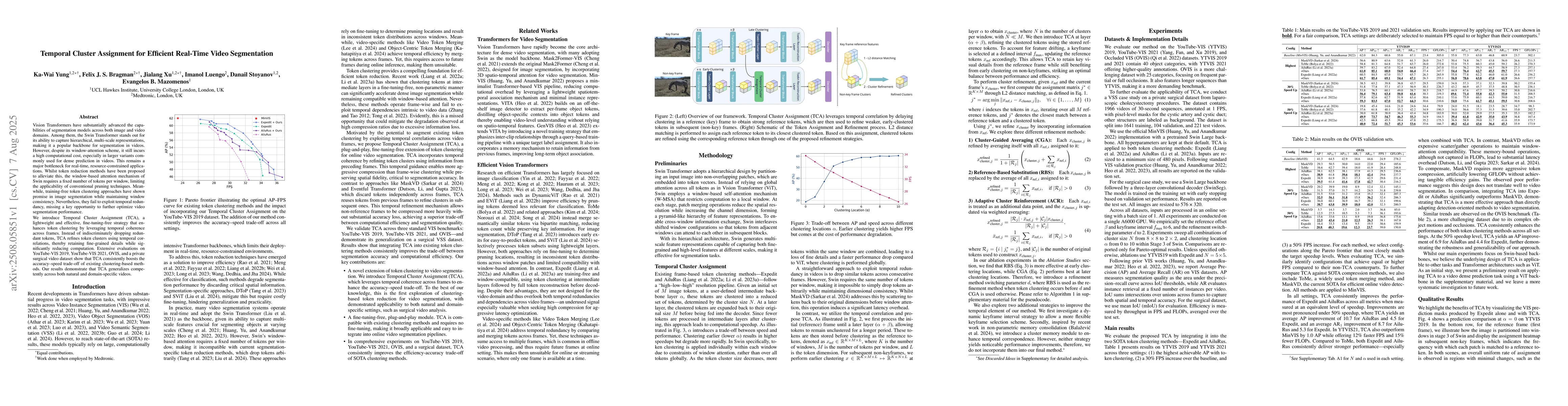 This research introduces Temporal Cluster Assignment (TCA), a method to optimize video segmentation using the Swin Transformer. TCA leverages temporal coherence across frames to refine token clusters, reducing computation while maintaining accuracy. Evaluations on various datasets show consistent improvement in the accuracy-speed trade-off compared to existing clustering-based methods.
