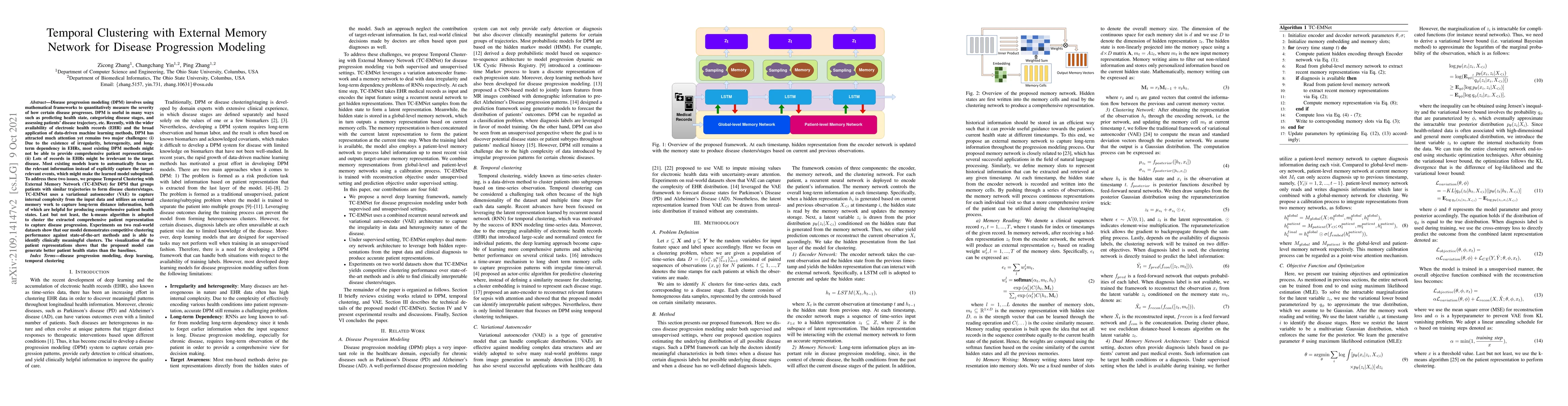 The paper proposes Temporal Clustering with External Memory Network (TC-EMNet) to model disease progression by clustering patients with similar trajectories and capturing long-term dependencies in electronic health records. The model uses a variational autoencoder and external memory network to produce comprehensive patient representations, demonstrating competitive performance in real-world datasets.