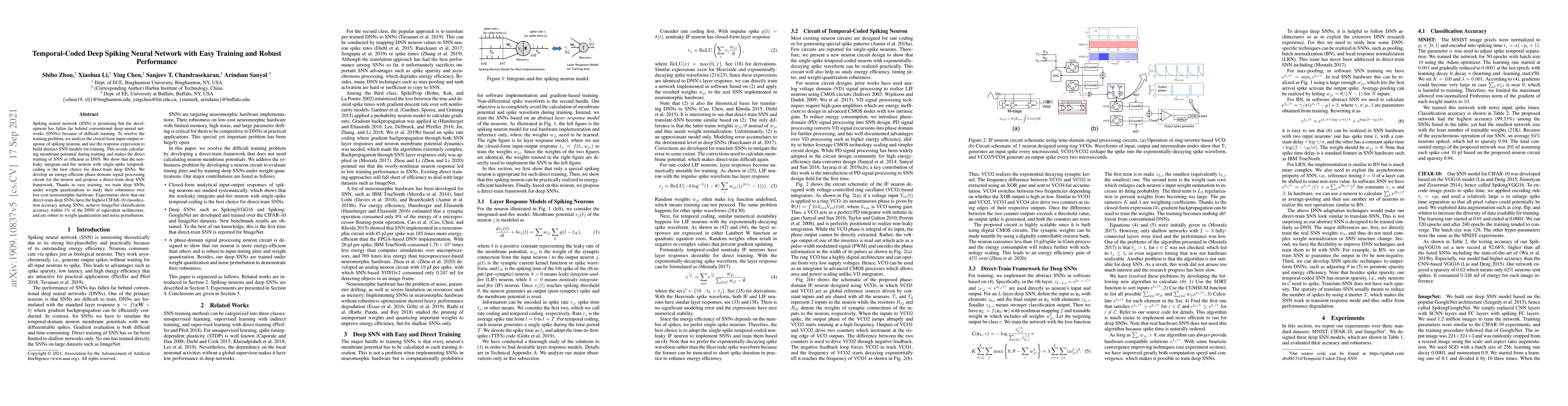 This paper presents a deep temporal-coded spiking neural network (SNN) that can be trained easily and achieves performance comparable to deep neural networks (DNNs) on CIFAR10 and ImageNet. The study also demonstrates the network's robustness and energy efficiency, showing a 90% gain over existing methods through a phase-domain signal processing circuit.