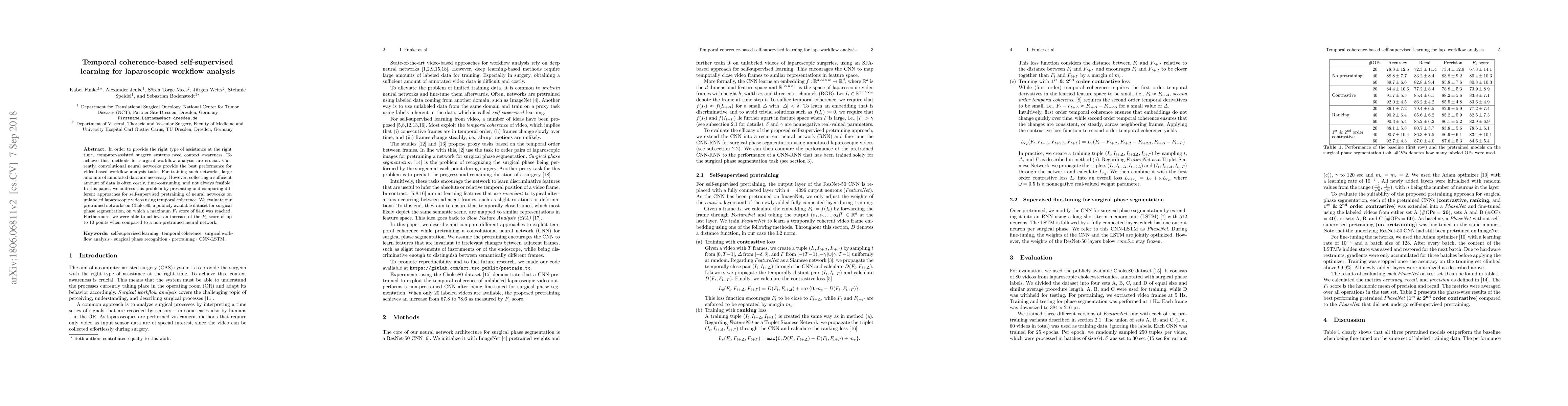 A new method for self-supervised learning of laparoscopic workflow analysis using temporal coherence has been proposed, achieving an F1 score of 84.6 on a public dataset.