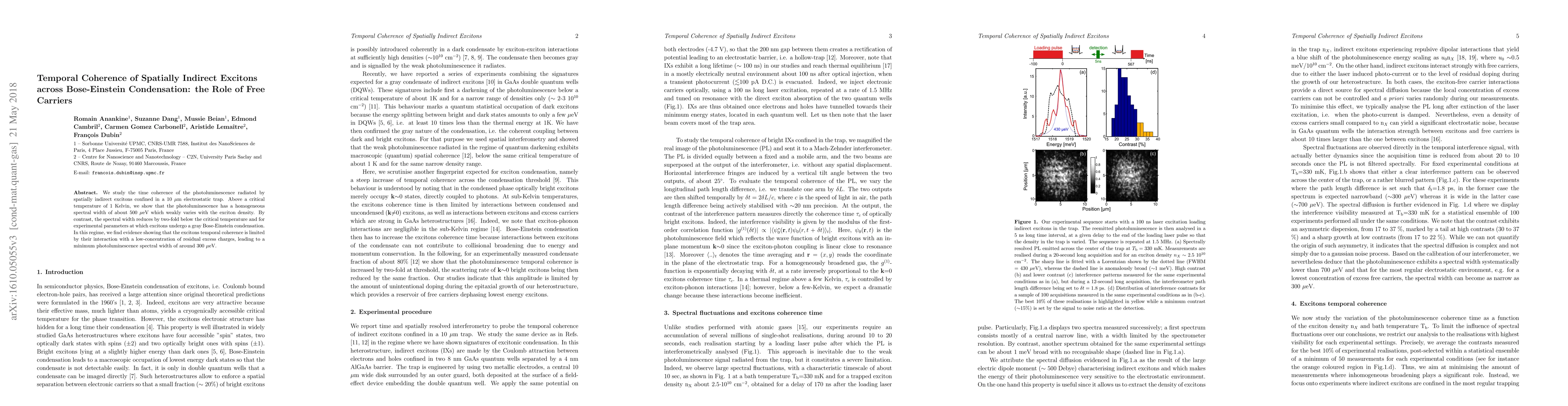We study the time coherence of the photoluminescence radiated by spatially indirect excitons confined in a 10 $\mu$m electrostatic trap. Above a critical temperature of 1 Kelvin, we show that the photoluminescence has a homogeneous spectral width of about 500 $\mu$eV which weakly varies with the exciton density. By contrast, the spectral width reduces by two-fold below the critical temperature and for experimental parameters at which excitons undergo a gray Bose-Einstein condensation. In this regime, we find evidence showing that the excitons temporal coherence is limited by their interaction with a low-concentration of residual excess charges, leading to a minimum photoluminescence spectral width of around 300 $\mu$eV.