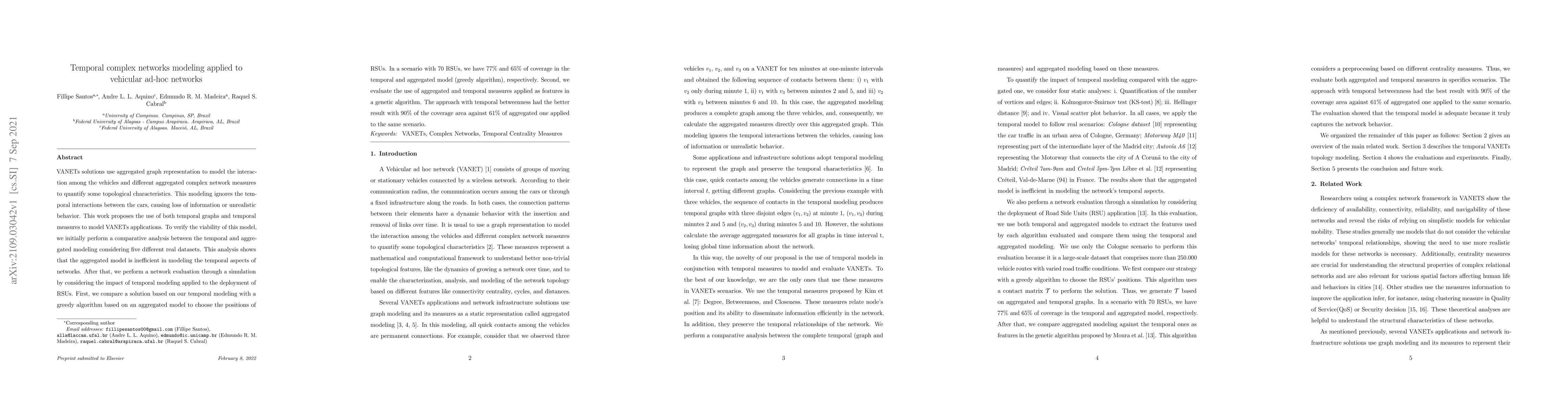 VANETs solutions use aggregated graph representation to model the interaction among the vehicles and different aggregated complex network measures to quantify some topological characteristics. This modeling ignores the temporal interactions between the cars, causing loss of information or unrealistic behavior. This work proposes the use of both temporal graphs and temporal measures to model VANETs applications. To verify the viability of this model, we initially perform a comparative analysis between the temporal and aggregated modeling considering five different real datasets. This analysis shows that the aggregated model is inefficient in modeling the temporal aspects of networks. After that, we perform a network evaluation through a simulation by considering the impact of temporal modeling applied to the deployment of RSUs. First, we compare a solution based on our temporal modeling with a greedy algorithm based on an aggregated model to choose the positions of RSUs. In a scenario with 70 RSUs, we have 77% and 65% of coverage in the temporal and aggregated model (greedy algorithm), respectively. Second, we evaluate the use of aggregated and temporal measures applied as features in a genetic algorithm. The approach with temporal betweenness had the better result with 90% of the coverage area against 61% of aggregated one applied to the same scenario.