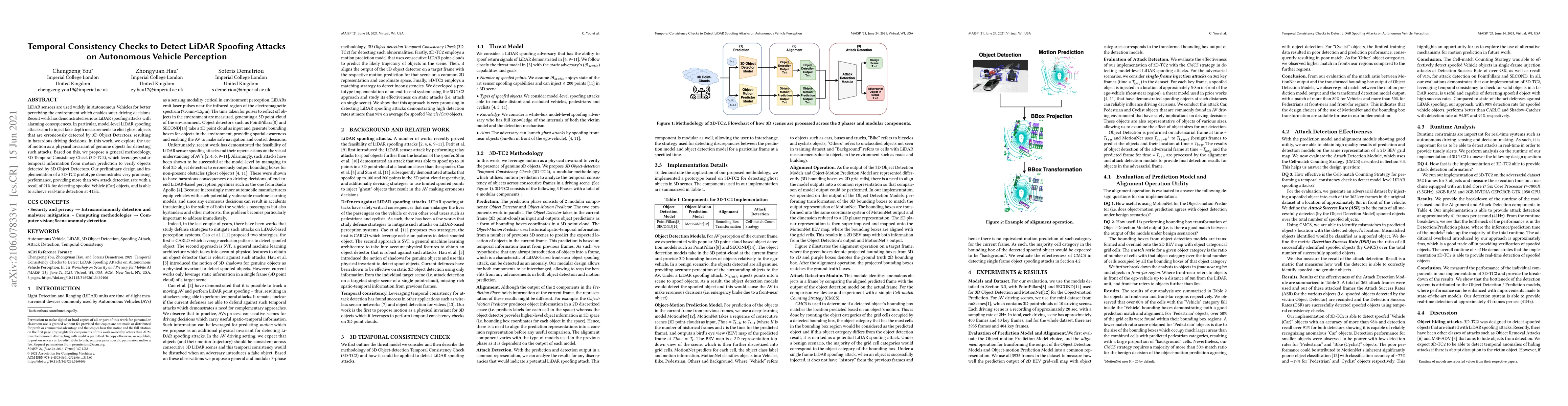 This paper proposes a methodology called 3D Temporal Consistency Check (3D-TC2) to detect LiDAR spoofing attacks in autonomous vehicles by leveraging motion as a physical invariant. The preliminary prototype achieves over 98% attack detection rate with 91% recall for spoofed vehicle detection and operates in real-time at 41Hz.