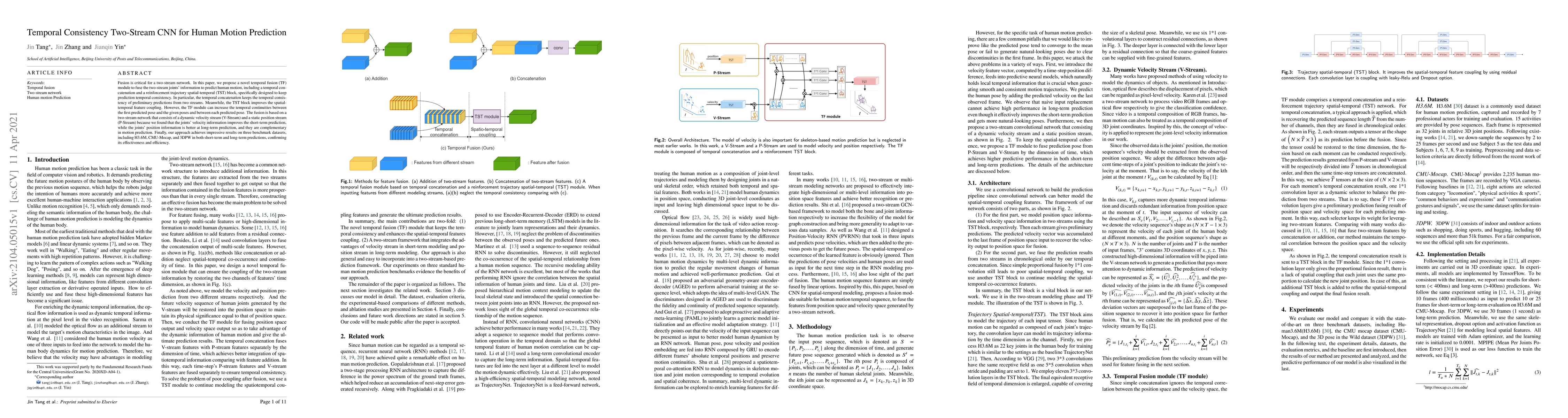 This paper proposes a novel temporal fusion module for a two-stream CNN to enhance human motion prediction by combining dynamic velocity and static position streams. The module achieves temporal consistency and improved spatial-temporal feature coupling, leading to effective short-term and long-term predictions on benchmark datasets.