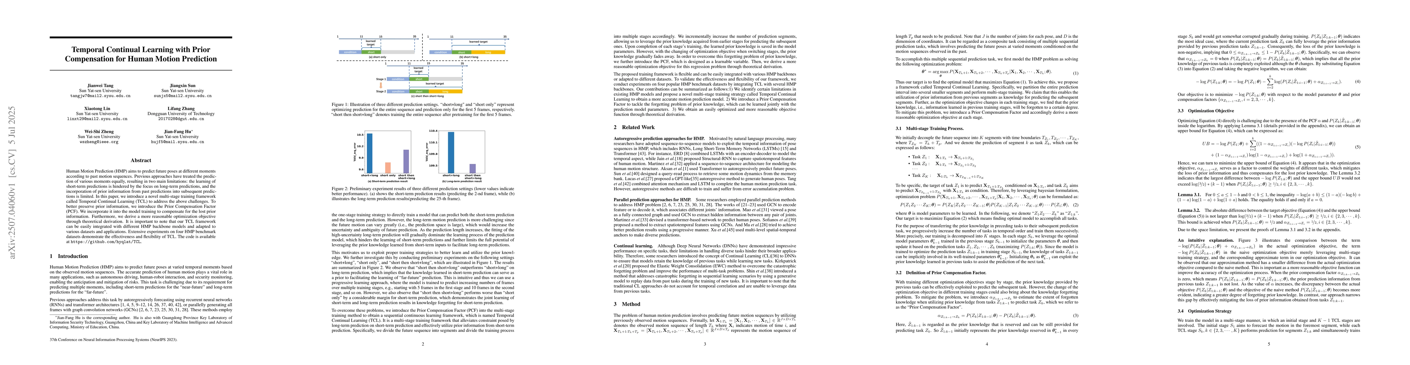 Human Motion Prediction (HMP) aims to predict future poses at different moments according to past motion sequences. Previous approaches have treated the prediction of various moments equally, resulting in two main limitations: the learning of short-term predictions is hindered by the focus on long-term predictions, and the incorporation of prior information from past predictions into subsequent predictions is limited. In this paper, we introduce a novel multi-stage training framework called Temporal Continual Learning (TCL) to address the above challenges. To better preserve prior information, we introduce the Prior Compensation Factor (PCF). We incorporate it into the model training to compensate for the lost prior information. Furthermore, we derive a more reasonable optimization objective through theoretical derivation. It is important to note that our TCL framework can be easily integrated with different HMP backbone models and adapted to various datasets and applications. Extensive experiments on four HMP benchmark datasets demonstrate the effectiveness and flexibility of TCL. The code is available at https://github.com/hyqlat/TCL.