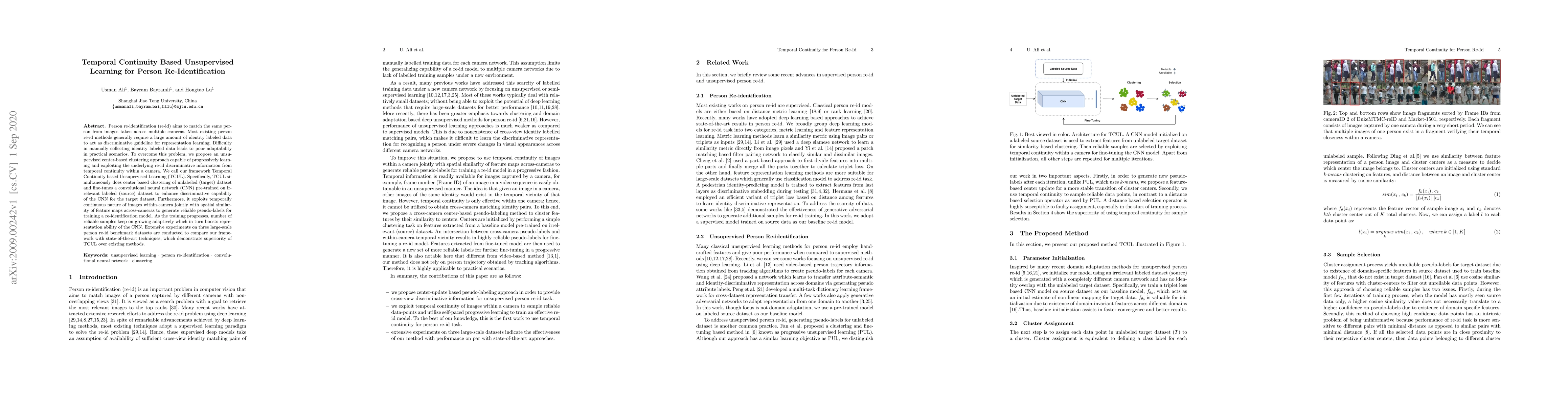 The paper proposes an unsupervised learning framework called Temporal Continuity based Unsupervised Learning (TCUL) for person re-identification, which leverages temporal continuity within a camera to learn discriminative features without requiring labeled data. TCUL fine-tunes a pre-trained CNN and generates pseudo-labels to improve model performance, demonstrating superior results compared to state-of-the-art methods on benchmark datasets.