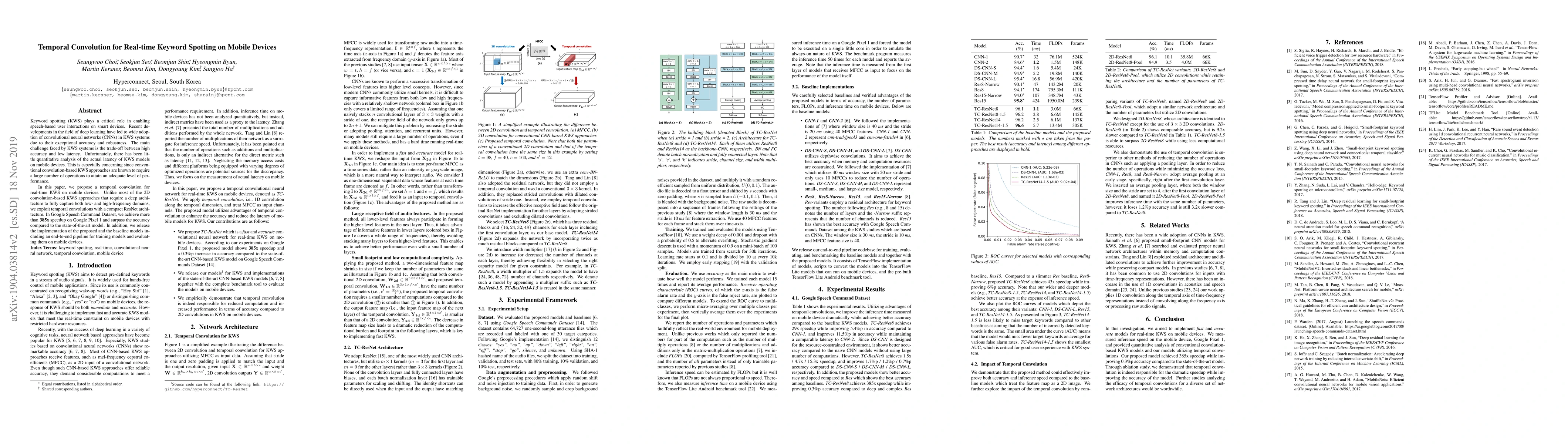 This paper proposes a temporal convolution approach combined with a compact ResNet architecture for real-time keyword spotting on mobile devices, achieving a significant speedup and surpassing state-of-the-art accuracy on the Google Speech Command Dataset. The authors also release their implementation for training and evaluation.