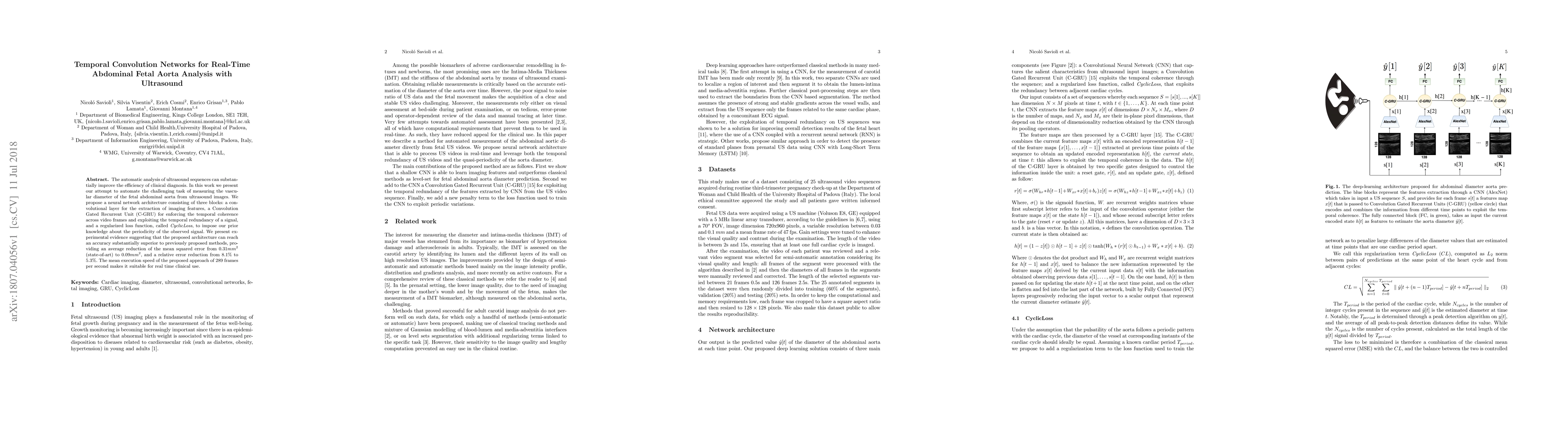 The automatic analysis of ultrasound sequences can substantially improve the efficiency of clinical diagnosis. In this work we present our attempt to automate the challenging task of measuring the vascular diameter of the fetal abdominal aorta from ultrasound images. We propose a neural network architecture consisting of three blocks: a convolutional layer for the extraction of imaging features, a Convolution Gated Recurrent Unit (C-GRU) for enforcing the temporal coherence across video frames and exploiting the temporal redundancy of a signal, and a regularized loss function, called \textit{CyclicLoss}, to impose our prior knowledge about the periodicity of the observed signal. We present experimental evidence suggesting that the proposed architecture can reach an accuracy substantially superior to previously proposed methods, providing an average reduction of the mean squared error from $0.31 mm^2$ (state-of-art) to $0.09 mm^2$, and a relative error reduction from $8.1\%$ to $5.3\%$. The mean execution speed of the proposed approach of 289 frames per second makes it suitable for real time clinical use.