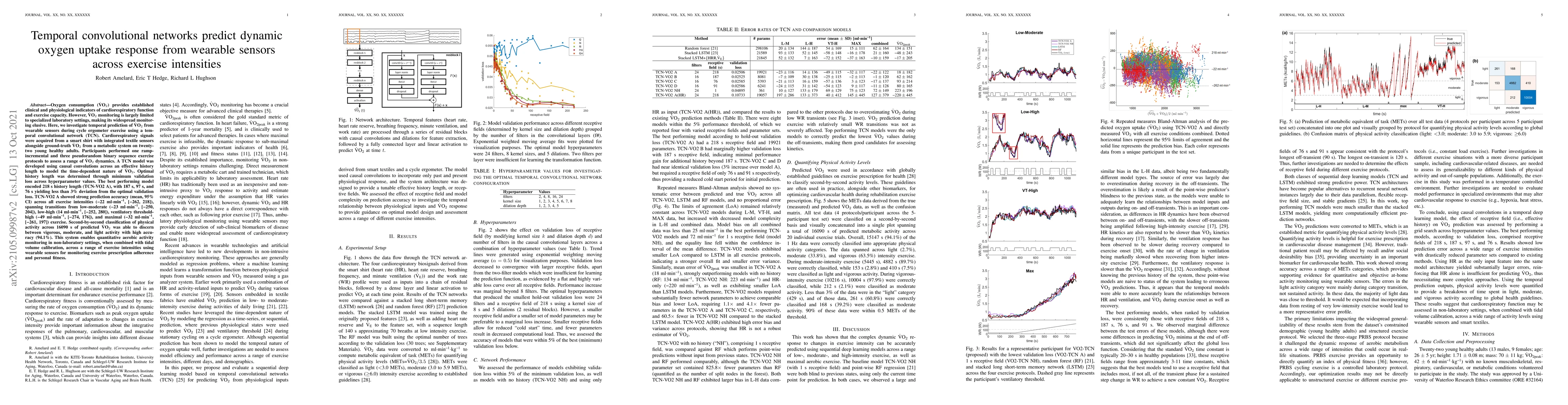 Oxygen consumption (VO$_2$) provides established clinical and physiological indicators of cardiorespiratory function and exercise capacity. However, VO$_2$ monitoring is largely limited to specialized laboratory settings, making its widespread monitoring elusive. Here, we investigate temporal prediction of VO$_2$ from wearable sensors during cycle ergometer exercise using a temporal convolutional network (TCN). Cardiorespiratory signals were acquired from a smart shirt with integrated textile sensors alongside ground-truth VO$_2$ from a metabolic system on twenty-two young healthy adults. Participants performed one ramp-incremental and three pseudorandom binary sequence exercise protocols to assess a range of VO$_2$ dynamics. A TCN model was developed using causal convolutions across an effective history length to model the time-dependent nature of VO$_2$. Optimal history length was determined through minimum validation loss across hyperparameter values. The best performing model encoded 218 s history length (TCN-VO$_2$ A), with 187 s, 97 s, and 76 s yielding less than 3% deviation from the optimal validation loss. TCN-VO$_2$ A showed strong prediction accuracy (mean, 95% CI) across all exercise intensities (-22 ml.min$^{-1}$, [-262, 218]), spanning transitions from low-moderate (-23 ml.min$^{-1}$, [-250, 204]), low-high (14 ml.min$^{-1}$, [-252, 280]), ventilatory threshold-high (-49 ml.min$^{-1}$, [-274, 176]), and maximal (-32 ml.min$^{-1}$, [-261, 197]) exercise. Second-by-second classification of physical activity across 16090 s of predicted VO$_2$ was able to discern between vigorous, moderate, and light activity with high accuracy (94.1%). This system enables quantitative aerobic activity monitoring in non-laboratory settings across a range of exercise intensities using wearable sensors for monitoring exercise prescription adherence and personal fitness.