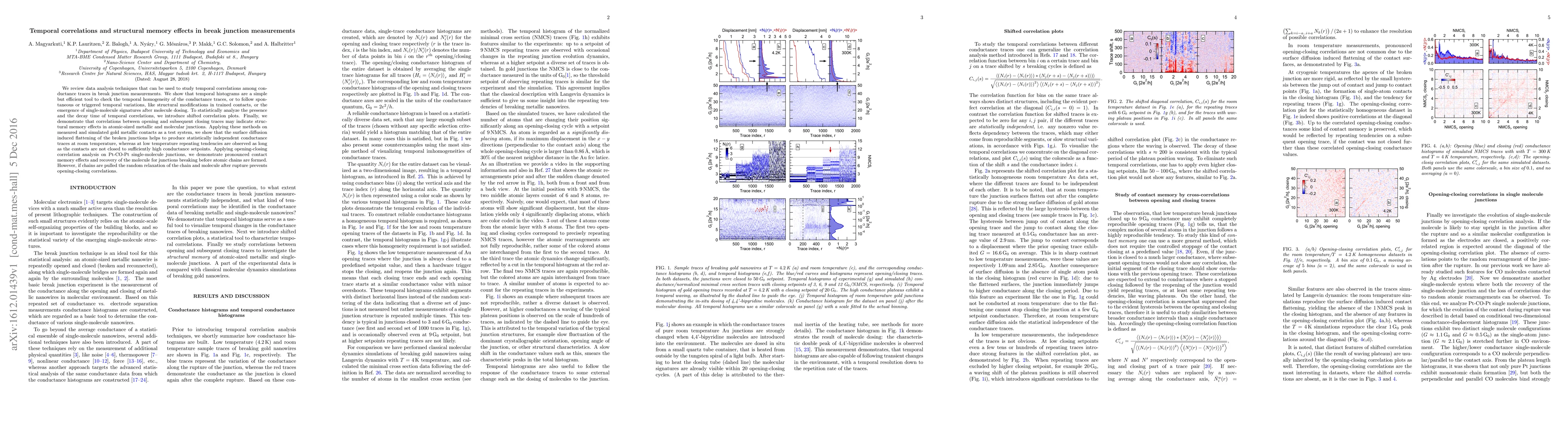 This paper reviews data analysis techniques for temporal correlations in break junction measurements, demonstrating that temporal histograms and shifted correlation plots can detect structural modifications and single-molecule signatures. It shows that structural memory effects in metallic and molecular junctions are indicated by correlations between opening and closing traces, with low-temperature contacts exhibiting repeating tendencies unless sufficiently high conductance setpoints are reached.