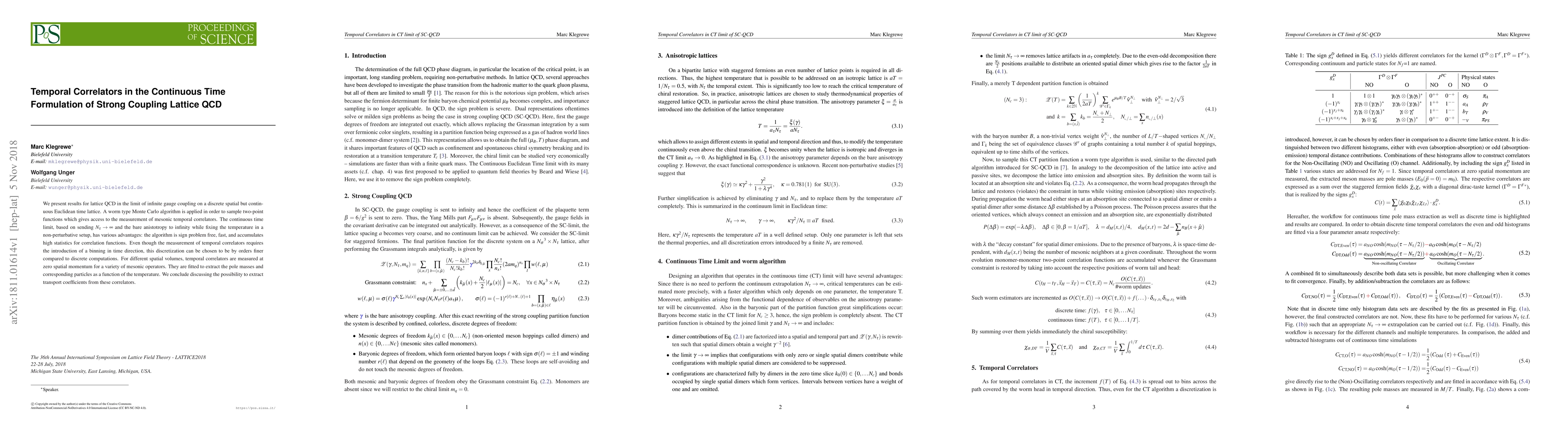 This paper investigates lattice QCD in the infinite gauge coupling limit using a continuous time formulation, employing a worm Monte Carlo algorithm to measure mesonic temporal correlators. The continuous time approach offers advantages like being free of sign problems and accumulating high statistics, allowing for precise extraction of pole masses and potential transport coefficients.
