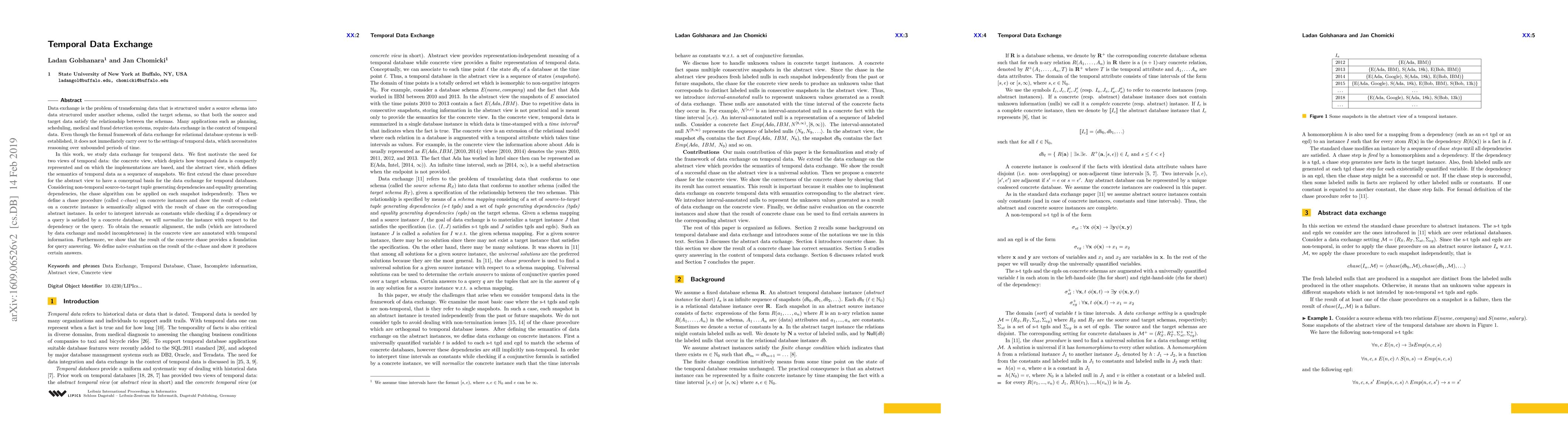 This paper explores data exchange for temporal data, distinguishing between concrete and abstract views. It extends the chase procedure to temporal databases, defining a c-chase on concrete instances that aligns semantically with the chase on abstract instances, and demonstrates its foundation for query answering.
