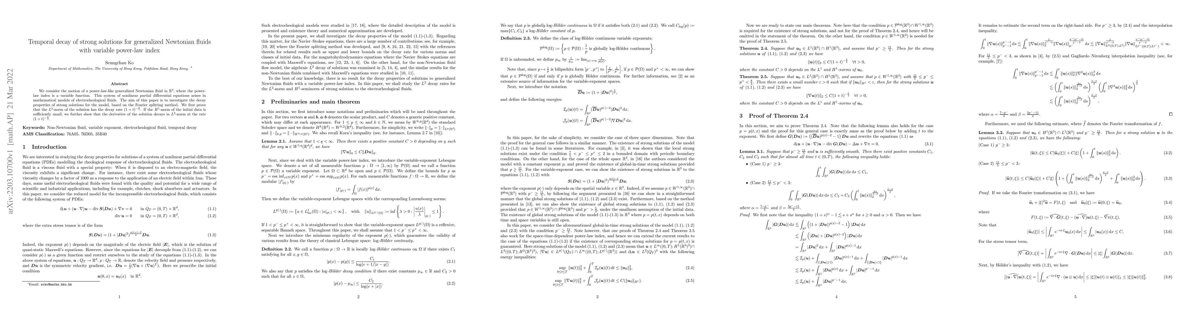 This paper investigates the decay properties of strong solutions for a generalized Newtonian fluid with a variable power-law index modeled by a system of nonlinear partial differential equations. Using the Fourier splitting method, it proves that the L^2-norm of the solution decays at a rate of (1 + t)^{-3/4}, and under small H^1-norm initial data conditions, the derivative decays in L^2-norm at (1 + t)^{-5/4}.