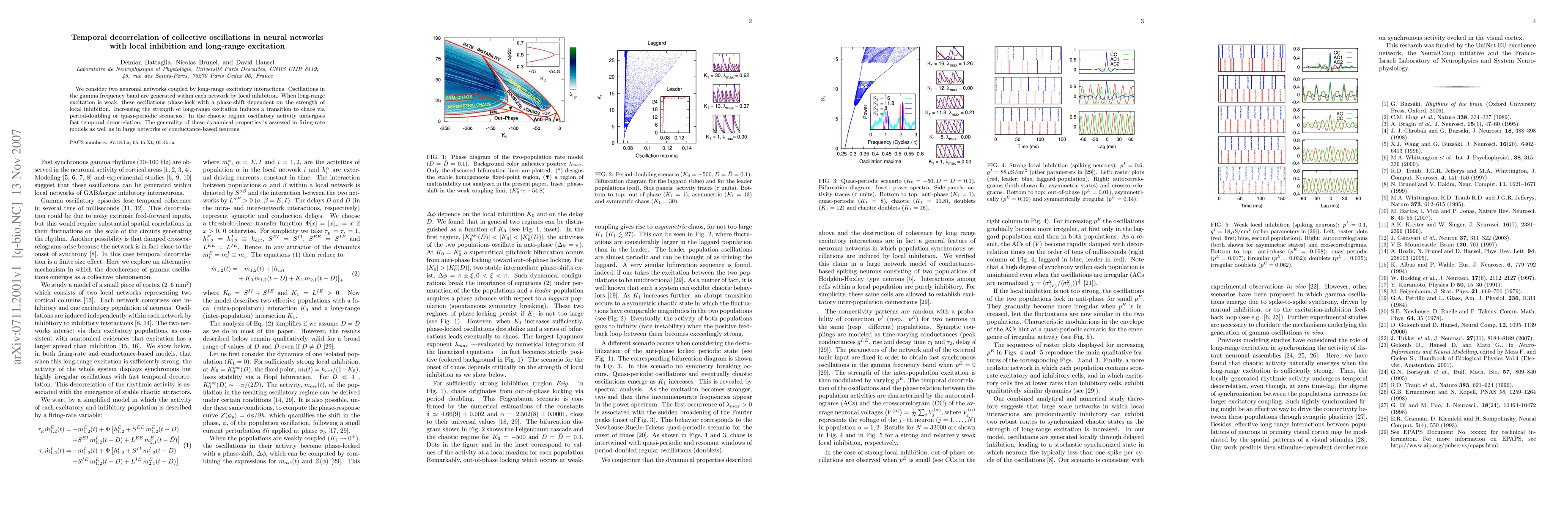 This paper investigates the dynamics of coupled neural networks with local inhibition and long-range excitation, finding that increased long-range excitation leads to chaotic behavior and rapid temporal decorrelation of oscillations. The study confirms these findings across both firing-rate models and detailed conductance-based neuron simulations.