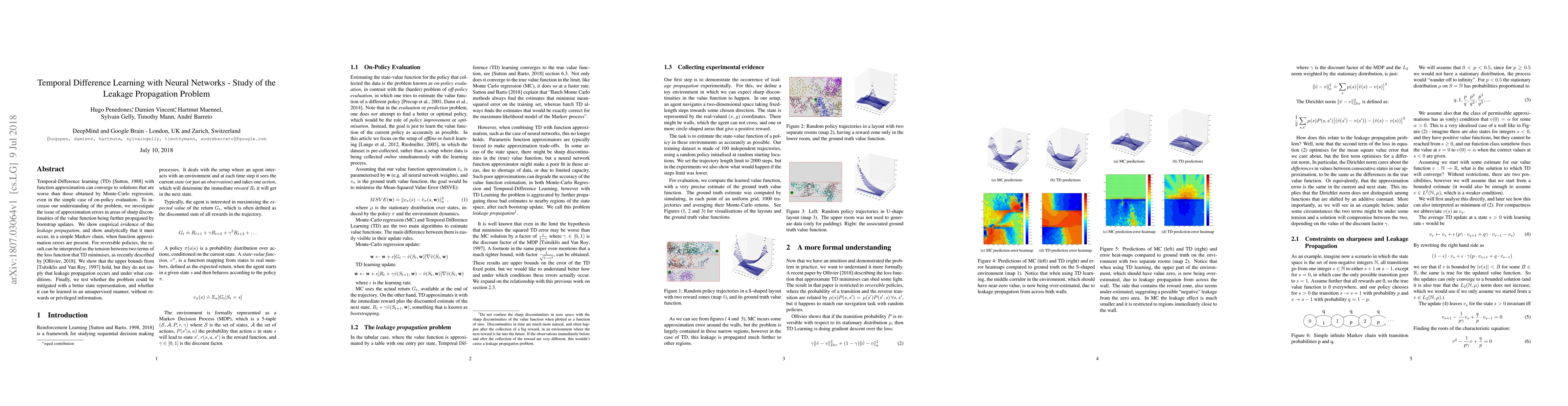 Temporal-Difference learning (TD) [Sutton, 1988] with function approximation can converge to solutions that are worse than those obtained by Monte-Carlo regression, even in the simple case of on-policy evaluation. To increase our understanding of the problem, we investigate the issue of approximation errors in areas of sharp discontinuities of the value function being further propagated by bootstrap updates. We show empirical evidence of this leakage propagation, and show analytically that it must occur, in a simple Markov chain, when function approximation errors are present. For reversible policies, the result can be interpreted as the tension between two terms of the loss function that TD minimises, as recently described by [Ollivier, 2018]. We show that the upper bounds from [Tsitsiklis and Van Roy, 1997] hold, but they do not imply that leakage propagation occurs and under what conditions. Finally, we test whether the problem could be mitigated with a better state representation, and whether it can be learned in an unsupervised manner, without rewards or privileged information.