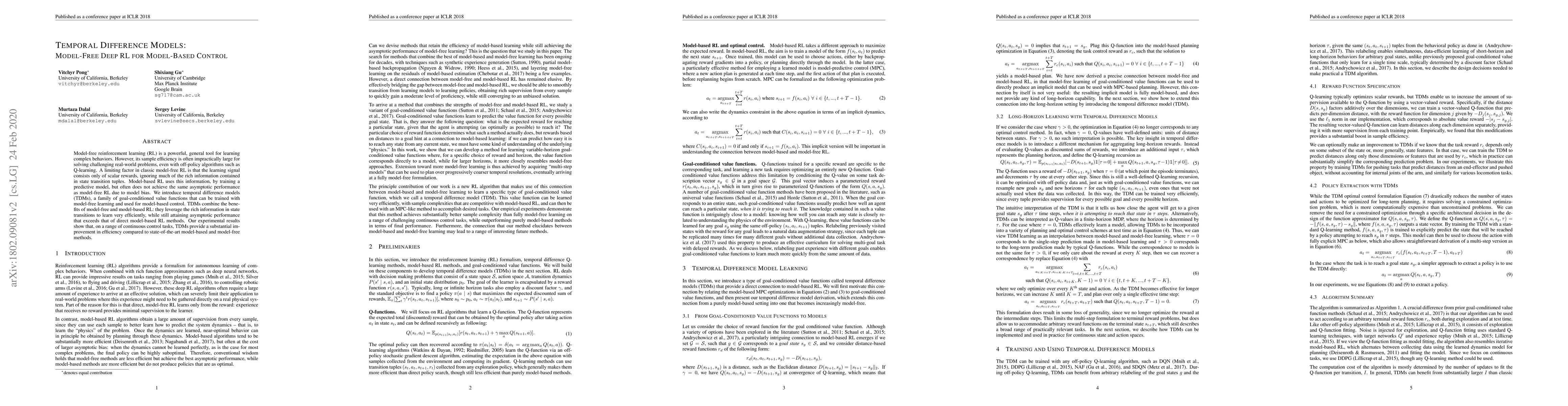 This paper introduces temporal difference models (TDMs) that combine model-free and model-based reinforcement learning to achieve high sample efficiency and performance. TDMs leverage state transition information for efficient learning while maintaining superior asymptotic performance compared to direct model-based RL methods.