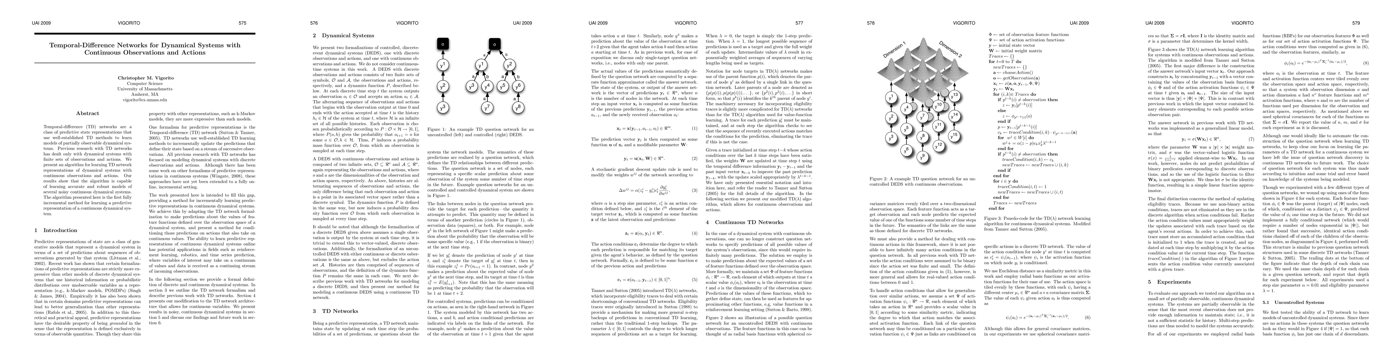 This paper introduces an algorithm for learning temporal-difference (TD) network representations of continuous dynamical systems with continuous observations and actions, demonstrating its effectiveness in creating accurate and robust models for noisy systems. This is the first fully incremental method for such predictive representations.