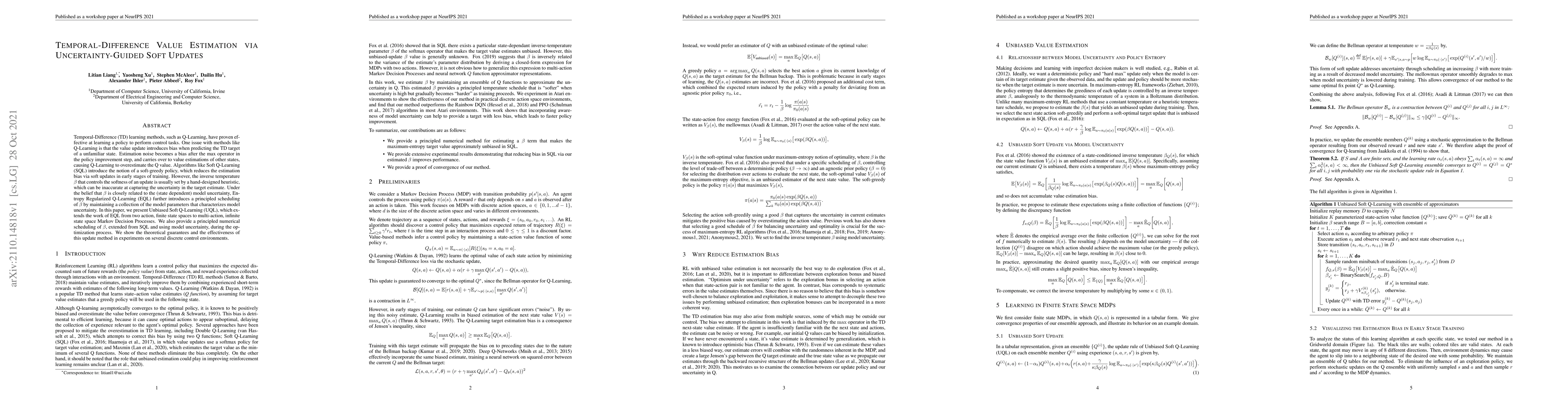 This paper introduces Unbiased Soft Q-Learning (UQL), a method that extends Entropy Regularized Q-Learning to handle multi-action, infinite state space Markov Decision Processes. It employs uncertainty-guided soft updates to reduce bias in value estimation, providing a principled numerical scheduling of the inverse temperature $\beta$ based on model uncertainty.