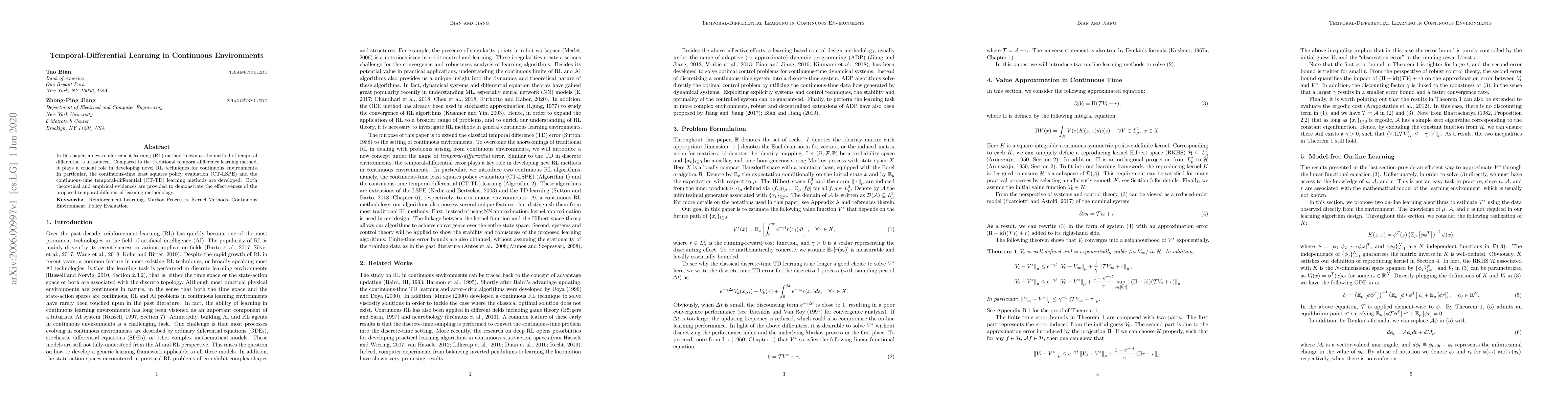 In this paper, a new reinforcement learning (RL) method known as the method of temporal differential is introduced. Compared to the traditional temporal-difference learning method, it plays a crucial role in developing novel RL techniques for continuous environments. In particular, the continuous-time least squares policy evaluation (CT-LSPE) and the continuous-time temporal-differential (CT-TD) learning methods are developed. Both theoretical and empirical evidences are provided to demonstrate the effectiveness of the proposed temporal-differential learning methodology.