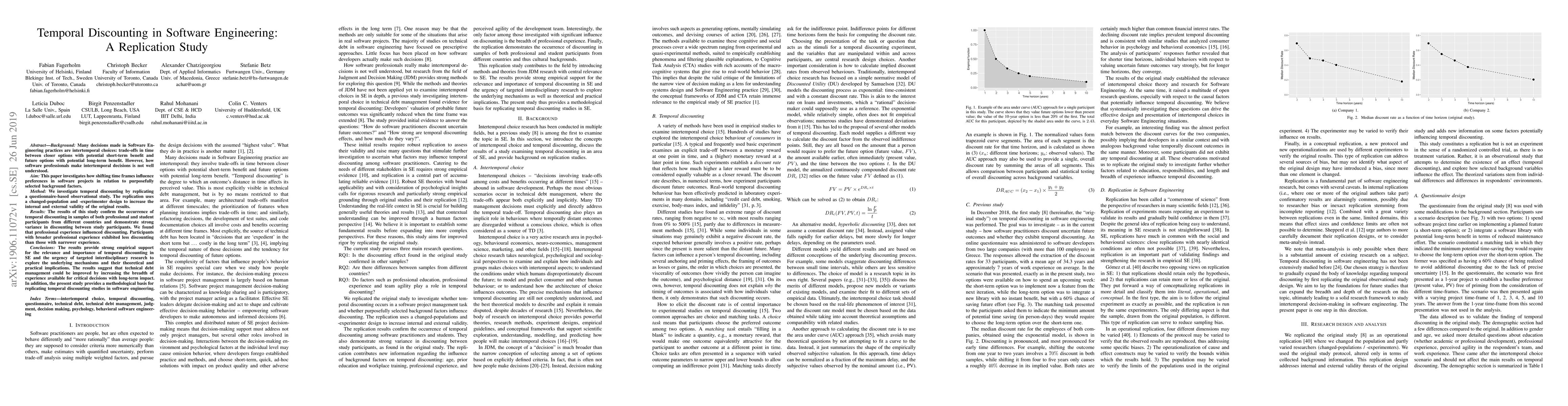 This study replicates a questionnaire-based observational study to investigate temporal discounting in software engineering, confirming its occurrence and revealing significant variance among participants. Findings suggest that professional experience reduces temporal discounting, highlighting the need for interdisciplinary research and broader experience in technical debt management.