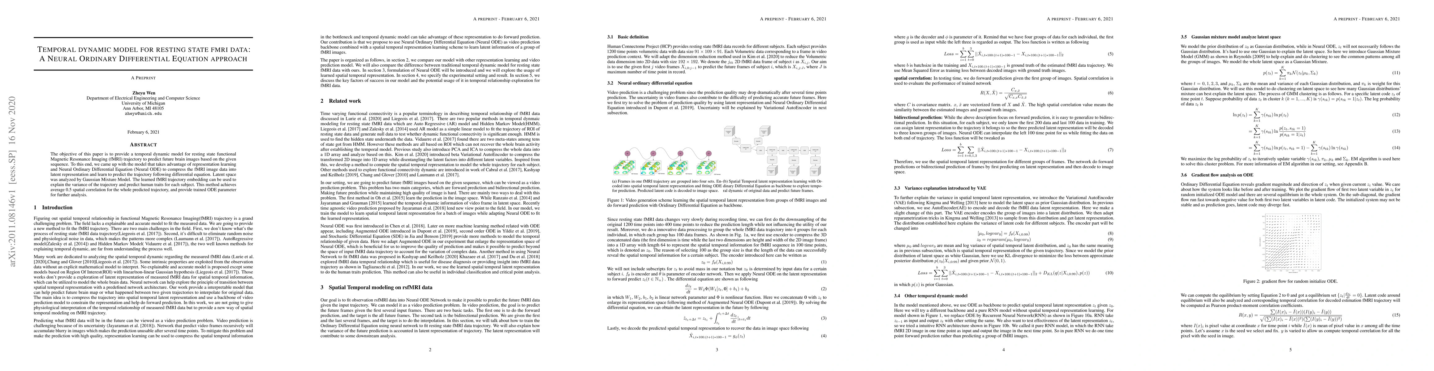 This paper proposes a temporal dynamic model using Neural Ordinary Differential Equations (Neural ODE) to predict future resting state fMRI images by compressing data into latent representations and learning trajectory predictions. The method achieves 0.5 spatial correlation on predicted trajectories and provides trained ODE parameters for further analysis.