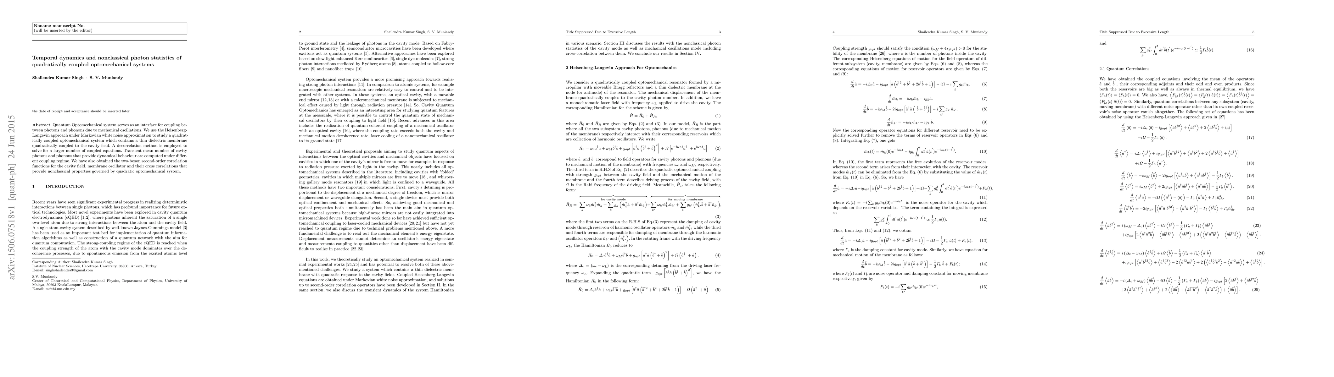 This paper investigates the dynamics of a quadratically coupled optomechanical system using the Heisenberg-Langevin approach, revealing transient mean photon and phonon numbers and nonclassical photon statistics through second-order correlation functions. The study highlights the system's nonclassical properties and its behavior under different coupling regimes.