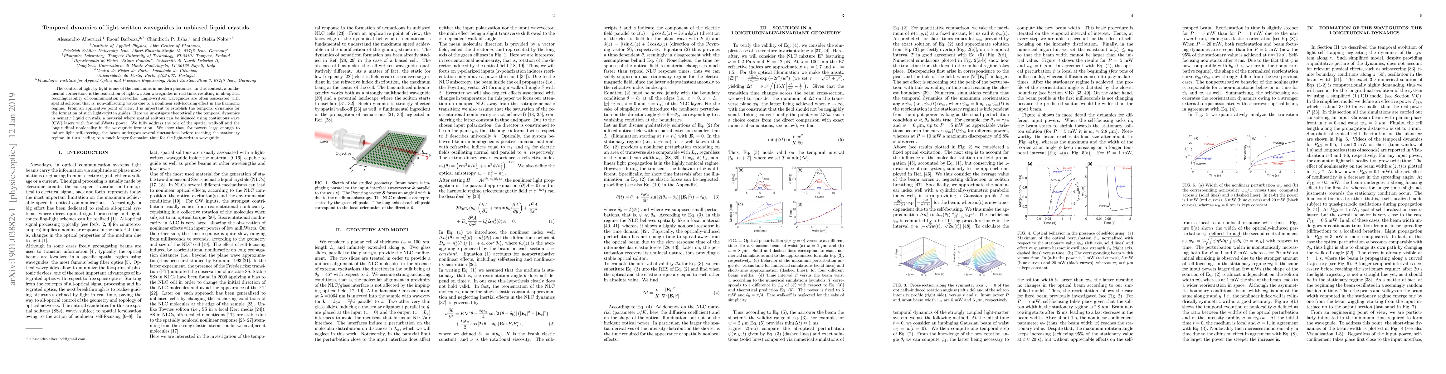 The control of light by light is one of the main aims in modern photonics. In this context, a fundamental cornerstone is the realization of light-written waveguides in real time, resulting in all-optical reconfigurability of communication networks. Light-written waveguides are often associated with spatial solitons, that is, non-diffracting waves due to a nonlinear self-focusing effect in the harmonic regime. From an applicative point of view, it is important to establish the temporal dynamics for the formation of such light-written guides. Here we investigate theoretically the temporal dynamics in nematic liquid crystals, a material where spatial solitons can be induced using continuous wave (CW) lasers with few milliWatts power. We fully address the role of the spatial walk-off and the longitudinal nonlocality in the waveguide formation. We show that, for powers large enough to induce light self-steering, the beam undergoes several fluctuations before reaching the stationary regime, in turn leading to a much longer formation time for the light-written waveguide.