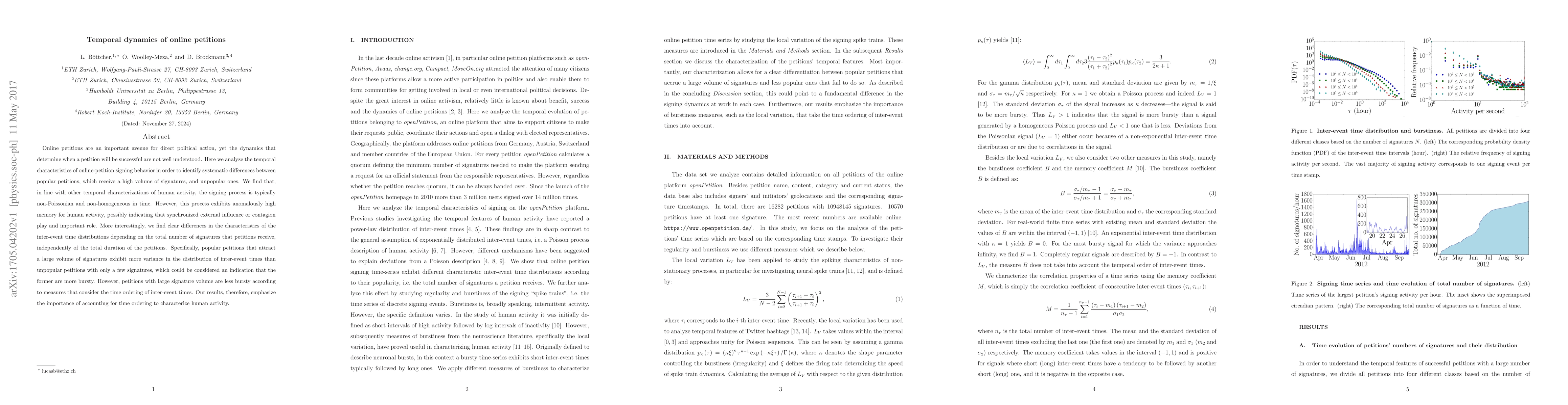 Online petitions exhibit non-Poissonian signing behavior with high memory for human activity, suggesting synchronized influence. Popular petitions show more variance in inter-event times than unpopular ones, but burstiness depends on time ordering.